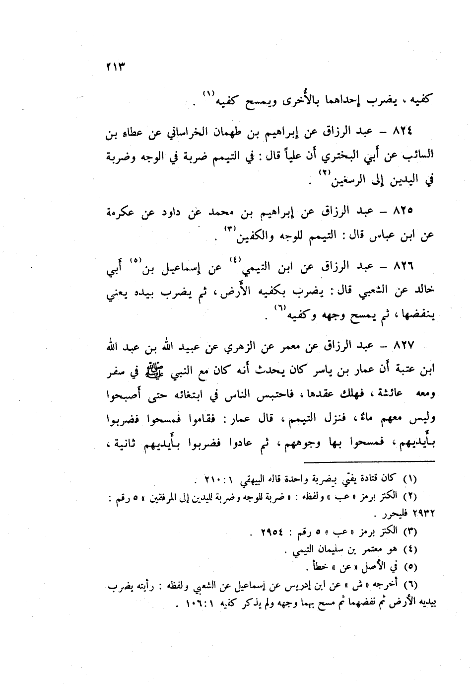825 - عَبْدُ الرَّزَّاقِ، عَنْ إِبْرَاهِيمَ بْنِ مُحَمَّدٍ، عَنْ دَاوُدَ، عَنْ عِكْرِمَةَ، عَنِ ابْنِ عَبَّاسٍ قَالَ: «§التَّيَمُّمُ لِلْوَجْهِ وَالْكَفَّيْنِ»