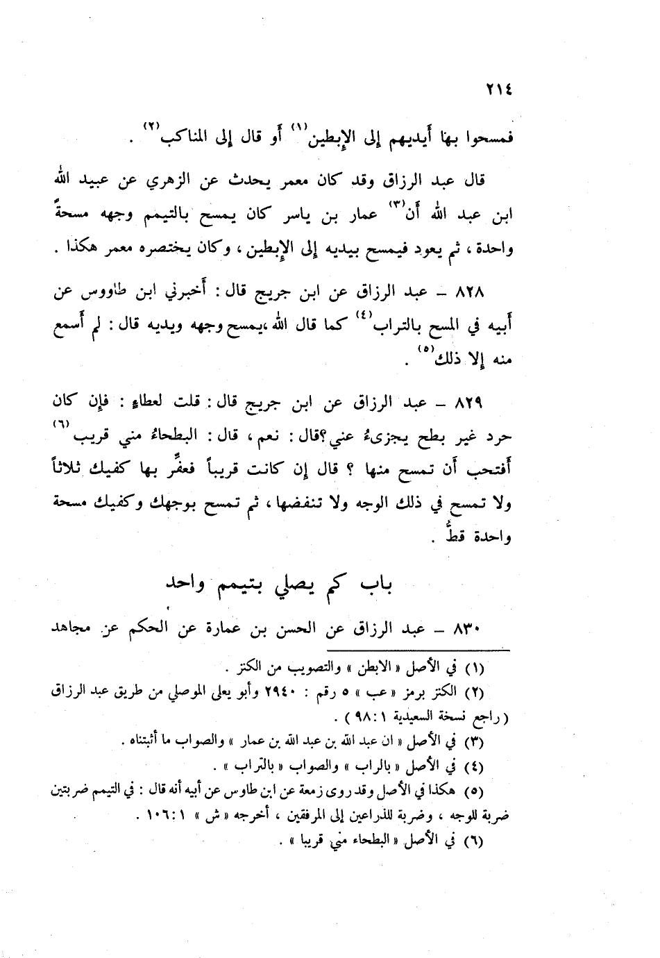 830 - عَبْدُ الرَّزَّاقِ، عَنِ الْحَسَنِ بْنِ عُمَارَةَ، عَنِ الْحَكَمِ، عَنْ مُجَاهِدٍ، عَنِ ابْنِ عَبَّاسٍ قَالَ: «مِنَ السُّنَّةِ أَنْ §لَا يُصَلِّيَ الرَّجُلُ بِالتَّيَمُّمِ إِلَّا صَلَاةً وَاحِدَةً، ثُمَّ يَتَيَمَّمُ لِلصَّلَاةِ الْأُخْرَى»