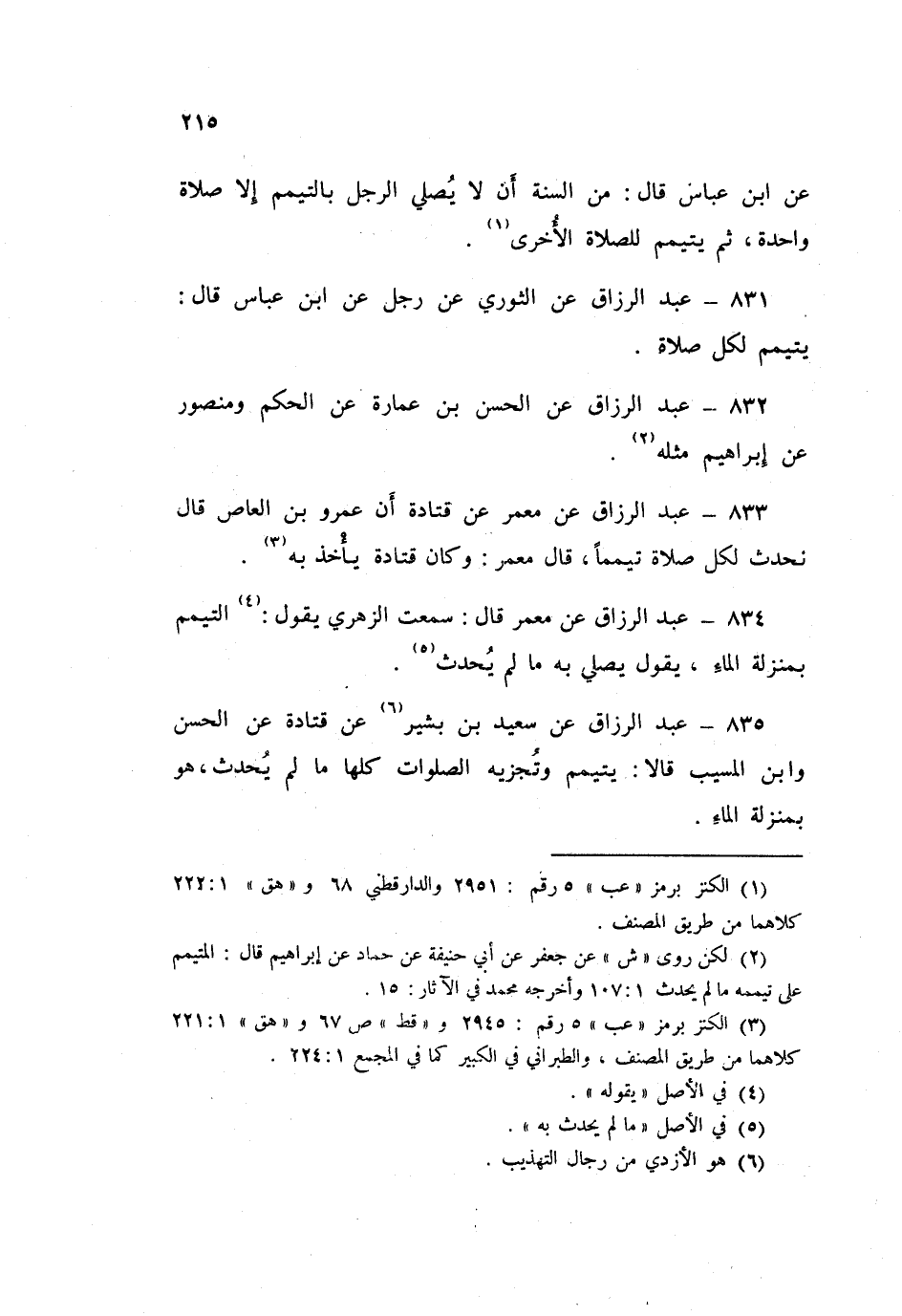 833 - عَبْدُ الرَّزَّاقِ، عَنْ مَعْمَرٍ، عَنْ قَتَادَةَ، أَنَّ عَمْرَو بْنَ الْعَاصِ قَالَ: «§نُحْدِثُ لِكُلِّ صَلَاةٍ تَيَمُّمًا». قَالَ مَعْمَرٌ: «وَكَانَ قَتَادَةُ يَأْخُذُ بِهِ»