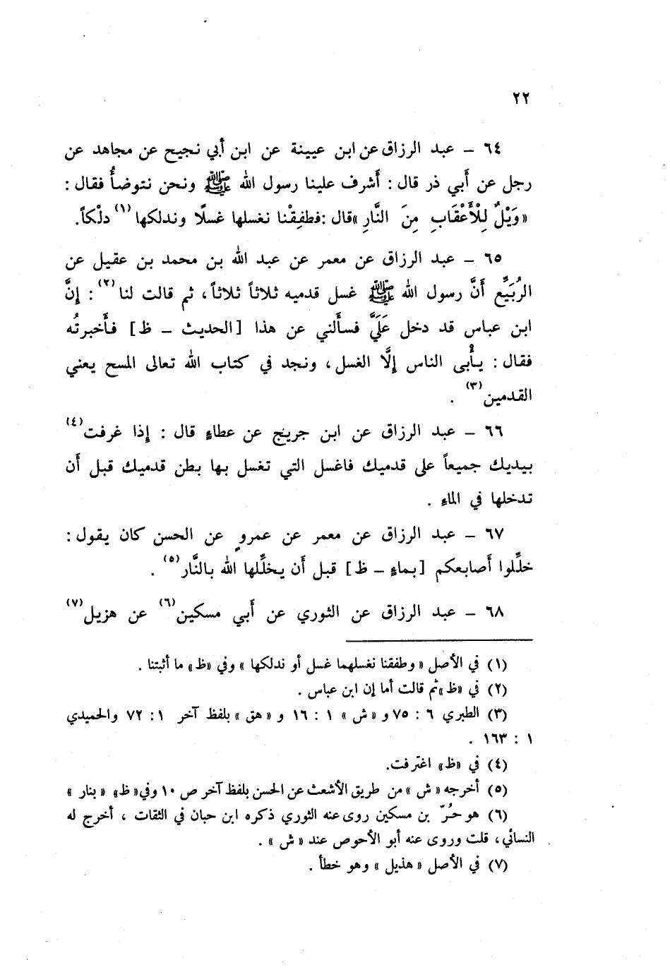 68 - عَبْدُ الرَّزَّاقِ، عَنِ الثَّوْرِيِّ، عَنْ أَبِي مِسْكِينٍ، عَنْ هُزَيْلِ بْنِ شُرَحْبِيلَ، عَنِ ابْنِ مَسْعُودٍ قَالَ: «§لَيَنْتَهِكَنَّ رَجُلٌ بَيْنَ أَصَابِعِهِ فِي الْوُضُوءِ - أَوْ لَيَنْتَهِكَنَّهُ النَّارُ -»