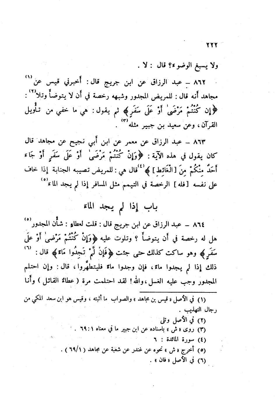 862 - عَبْدُ الرَّزَّاقِ، عَنِ ابْنِ جُرَيْجٍ قَالَ: أَخْبَرَنِي قَيْسٌ، عَنْ مُجَاهِدٍ، أَنَّهُ قَالَ: «§لِلْمَرِيضِ الْمَجْدُورِ وَشَبَهِهِ رُخْصَةٌ فِي أَنْ لَا يَتَوَضَّأَ» وَتَلَا: {إِنْ كُنْتُمْ مَرْضَى أَوْ عَلَى سَفَرٍ} [النساء: 43] ثُمَّ يَقُولُ: «هِيَ مَا خَفِيَ مِنْ تَأْوِيلِ الْقُرْآنِ»، وَعَنْ سَعِيدِ بْنِ جُبَيْرٍ مِثْلَهُ