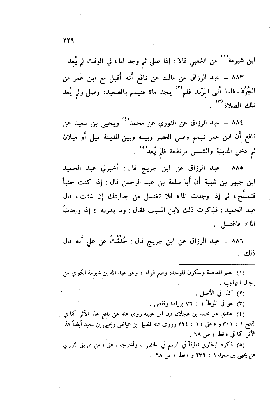 885 - عَبْدُ الرَّزَّاقِ، عَنِ ابْنِ جُرَيْجٍ قَالَ: أَخْبَرَنِي عَبْدُ الْحَمِيدِ بْنُ جُبَيْرِ بْنِ شَيْبَةَ، أَنَّ أَبَا سَلَمَةَ بْنَ عَبْدِ الرَّحْمَنِ قَالَ: «§إِذَا كُنْتَ جُنُبًا فَتَمَسَّحْ، ثُمَّ إِذَا وَجَدَتَ الْمَاءَ فَلَا تَغْتَسِلْ مِنْ جَنَابَتِكَ إِنْ شِئْتَ». قَالَ عَبْدُ الْحَمِيدِ: فَذَكَرْتُ ذَلِكَ لِابنِ الْمُسَيِّبِ، فَقَالَ: «وَمَا يُدْرِيهِ؟ إِذَا وَجَدْتَ الْمَاءَ فَاغْتَسِلْ».