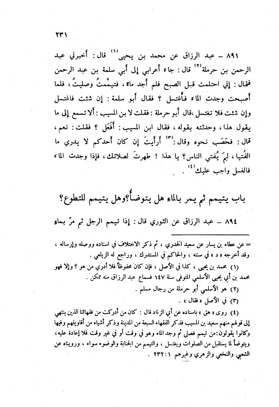891 - عَبْدُ الرَّزَّاقِ، عَنْ مُحَمَّدِ بْنِ يَحْيَى قَالَ: أَخْبَرَنِي عَبْدُ الرَّحْمَنِ بْنُ حَرْمَلَةَ قَالَ: جَاءَ أَعْرَابِيٌّ إِلَى أَبِي سَلَمَةَ بْنِ عَبْدِ الرَّحْمَنِ، فَقَالَ: §إِنِّي احْتَلَمْتُ قَبْلَ الصُّبْحِ فَلَمْ أَجِدْ مَاءً فَتَيَمَّمْتُ وَصَلَّيْتُ، فَلَمَّا أَصْبَحْتُ وَجَدْتُ الْمَاءَ فَأَغْتَسِلُ؟ فَقَالَ أَبُو سَلَمَةَ: «إِنْ شِئْتَ فَاغْتَسِلْ، وَإِنْ شِئْتَ فَلَا تَغْتَسِلْ». قَالَ أَبُو حَرْمَلَةَ: فَقُلْتُ لِابنِ الْمُسَيِّبِ: أَلَا تَسْمَعُ إِلَى مَا يَقُولُ هَذَا؟ وَحَدَّثْتُهُ بِقَولِهِ، فَقَالَ ابْنُ الْمُسَيِّبِ: «أَفَعَلَ؟» فَقُلْتُ: نَعَمْ قَالَ: فَحَصَبَ نَحْوَهُ، وَقَالَ: «أَرَأَيْتَ إِنْ كَانَ أَحَدُكُمْ لَا يَدْرِي مَا الْفُتْيَا، لِمَ يُفْتِي النَّاسَ؟ يَا هَذَا طَهُرْتَ لِصَلَاتِكَ فَإِذَا وَجَدْتَ الْمَاءَ فَالْغُسْلُ وَاجِبٌ عَلَيْكَ»