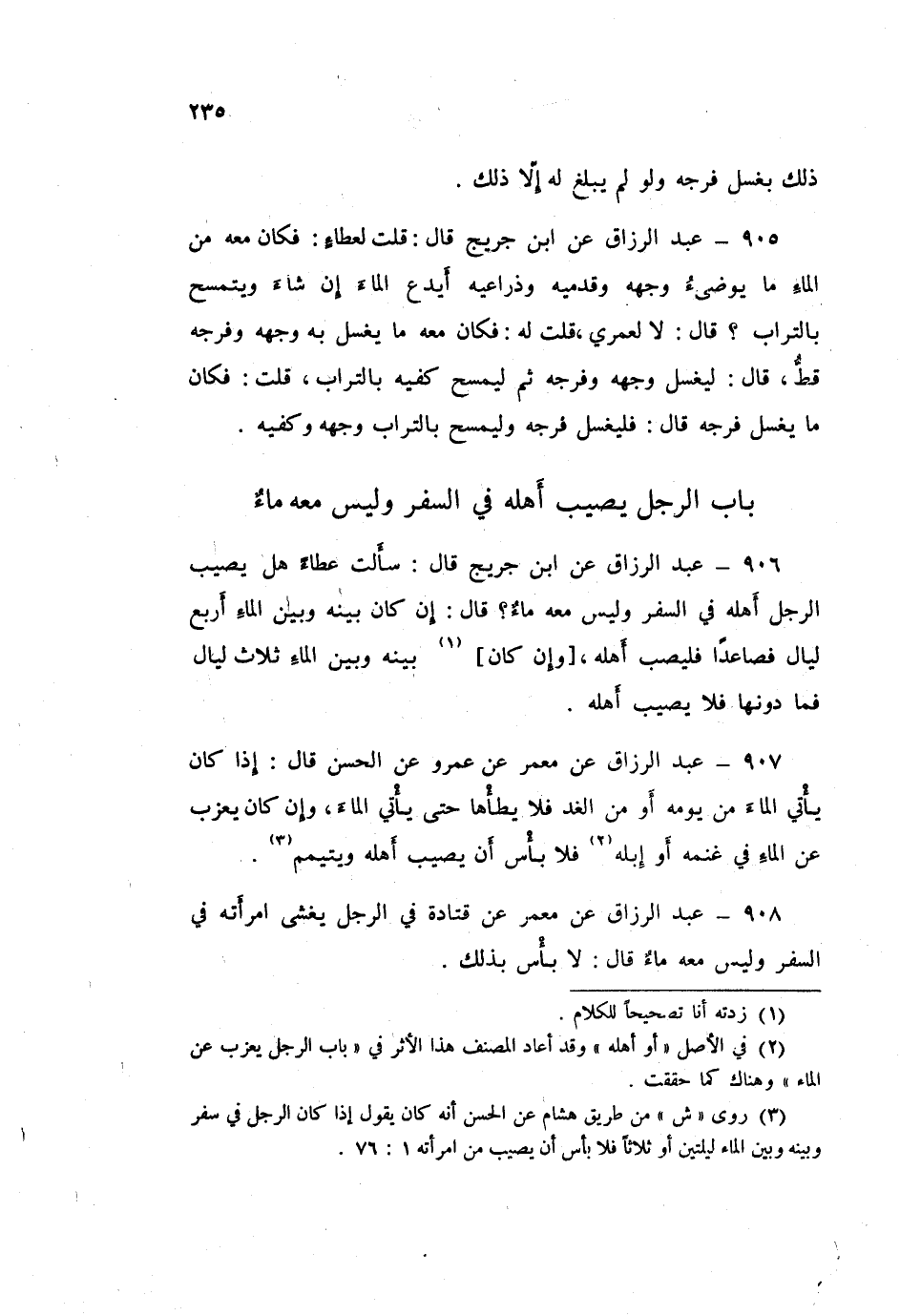 906 - عَبْدُ الرَّزَّاقِ، عَنِ ابْنِ جُرَيْجٍ قَالَ: سَأَلْتُ عَطَاءً: هَلْ يُصِيبُ الرَّجُلُ أَهْلَهُ فِي السَّفَرِ وَلَيْسَ مَعَهُ مَاءٌ؟ قَالَ: «§إِنْ كَانَ بَيْنَهُ وَبَيْنَ الْمَاءِ أَرْبَعُ لَيَالٍ فَصَاعِدًا فَلْيُصِبْ أَهْلَهُ، وَإِنْ كَانَ بَيْنَهُ وَبَيْنَ الْمَاءِ ثَلَاثُ لَيَالٍ فَمَا دُونَهَا فَلَا يُصِبْ أَهْلَهُ»