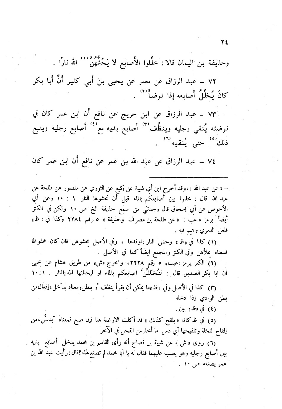 73 - عَبْدُ الرَّزَّاقِ، عَنِ ابْنِ جُرَيْجٍ، عَنْ نَافِعٍ، أَنَّ ابْنَ عُمَرَ كَانَ §فِي تَوَضُّئِهِ يُنَقِّي رِجْلَيْهِ، وَيُنَظِّفُ أَصَابِعَ يَدَيْهِ مَعَ أَصَابِعِ رِجْلَيْهِ، وَيُتْبِعُ ذَلِكَ حَتَّى يُنَقِّيَهُ "