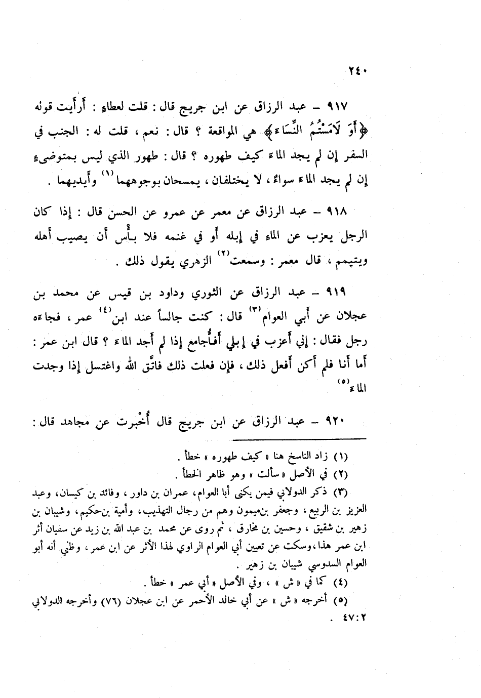 919 - عَبْدُ الرَّزَّاقِ، عَنِ الثَّوْرِيِّ، وَدَاوُدَ بْنِ قَيْسٍ، عَنْ مُحَمَّدِ بْنِ عَجْلَانَ، عَنْ أَبِي الْعَوَّامِ قَالَ: كُنْتُ جَالِسًا عِنْدَ ابْنِ عُمَرَ فَجَاءَهُ رَجُلٌ فَقَالَ: §إِنِّي أَعْزُبُ فِي إِبِلِي أَفَأُجَامِعُ إِذَا لَمْ أَجِدِ الْمَاءَ؟ قَالَ ابْنُ عُمَرَ: «أَمَّا أَنَا فَلَمْ أَكُنْ أَفْعَلُ ذَلِكَ فَإِنْ فَعَلْتَ ذَلِكَ فَاتَّقِ اللَّهَ، وَاغْتَسِلْ إِذَا وَجَدْتَ الْمَاءَ»
