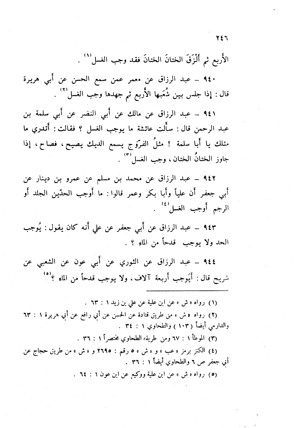 941 - عَبْدُ الرَّزَّاقِ، عَنْ مَالِكٍ، عَنْ أَبِي النَّضْرِ، عَنْ أَبِي سَلَمَةَ بْنِ عَبْدِ الرَّحْمَنِ قَالَ: سَأَلْتُ عَائِشَةَ، مَا يُوجِبُ الْغُسْلَ؟ فَقَالَتْ: «أَتَدْرِي مَا مِثْلُكَ يَا أَبَا سَلَمَةَ؟ مِثْلُ الْفَرُّوجِ يَسْمَعُ الدِّيكَ يَصِيحُ فَصَاحَ، §إِذَا جَاوَزَ الْخِتَانُ الْخِتَانَ وَجَبَ الْغُسْلُ»