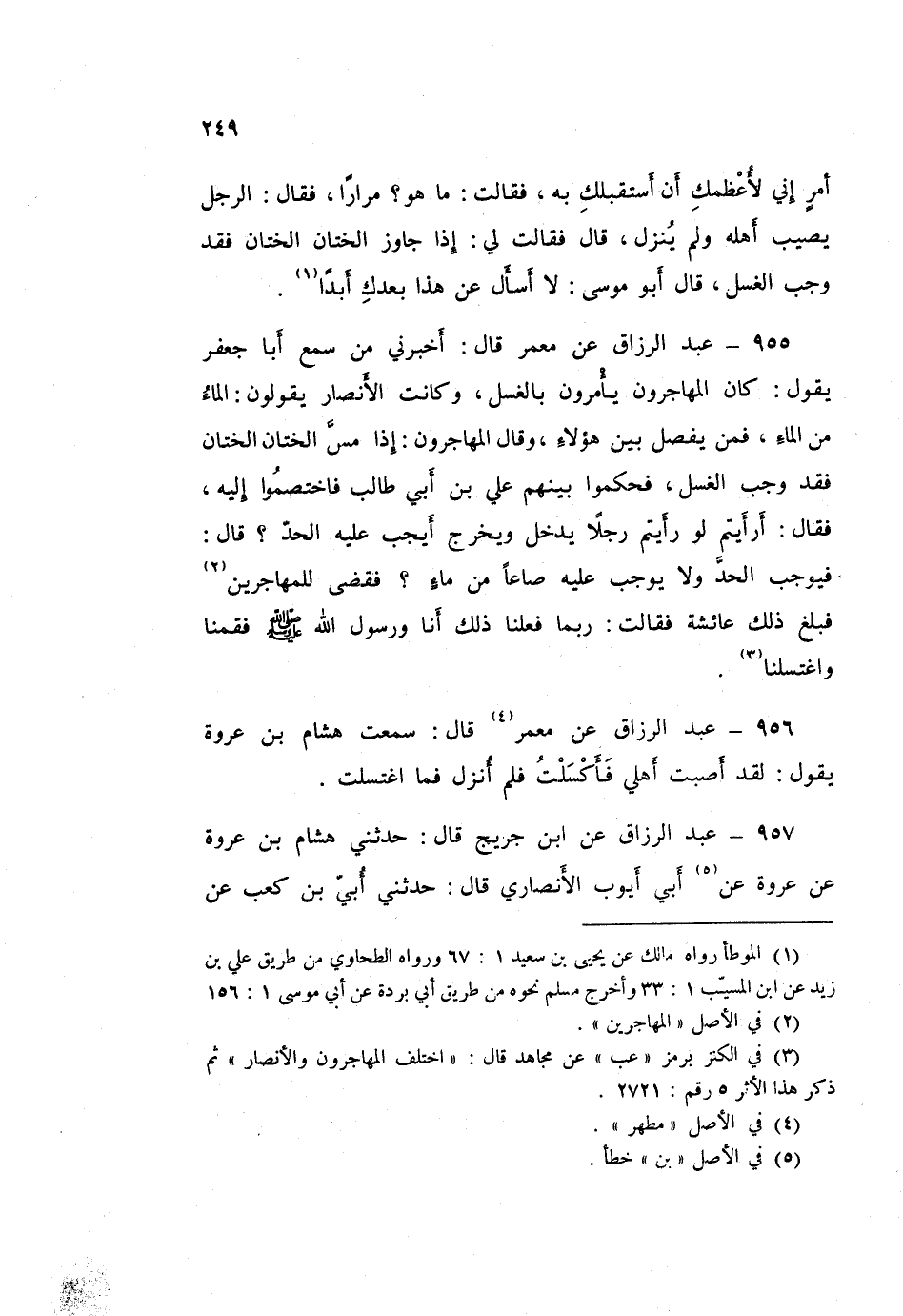 957 - عَبْدُ الرَّزَّاقِ، عَنِ ابْنِ جُرَيْجٍ قَالَ: حَدَّثَنِي هِشَامُ بْنُ عُرْوَةَ، عَنْ عُرْوَةَ، عَنْ أَبِي أَيُّوبَ الْأَنْصَارِيِّ قَالَ: حَدَّثَنِي أُبَيُّ بْنُ كَعْبٍ، عَنْ رَسُولِ اللَّهِ صَلَّى اللهُ عَلَيْهِ وَسَلَّمَ قَالَ:: أَرَأَيْتَ إِذَا جَامَعَ أَحَدُنَا فَأَكْسَلَ، وَلَمْ يُمْنِ، فَقَالَ رَسُولُ اللَّهِ صَلَّى اللهُ عَلَيْهِ وَسَلَّمَ: «§يَغْسِلُ مَا مَسَّ مِنْهُ وَلْيَتَوَضَّأْ». قَالَ: فَكَانَ أَبُو أَيُّوبَ يُفْتِي بِهَذَا، عَنْ أُبَيِّ بْنِ كَعْبٍ