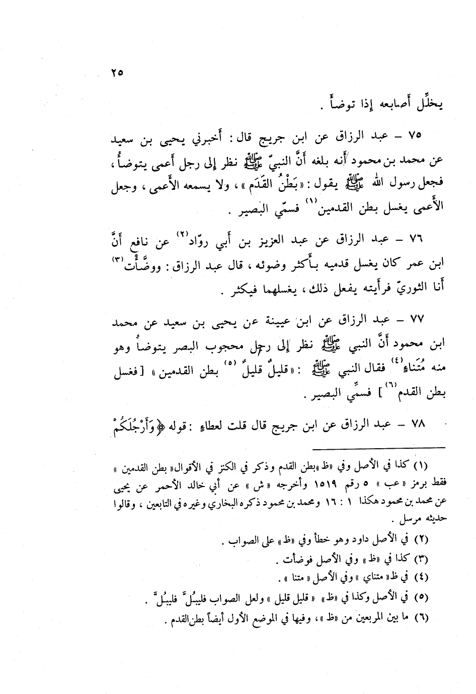 78 - عَبْدُ الرَّزَّاقِ، عَنِ ابْنِ جُرَيْجٍ قَالَ: قُلْتُ لِعَطَاءٍ: قَوْلُهُ: {§وَأَرْجُلَكُمْ إِلَى الْكَعْبَيْنِ} [المائدة: 6] تَرَى الْكَعْبَيْنِ فِيمَا يُغْسَلُ مِنَ الْقَدَمَيْنِ؟ قَالَ: «نَعَمْ، لَا شَكَّ فِيهِ»