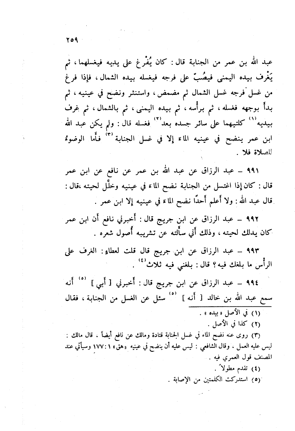 991 - عَبْدُ الرَّزَّاقِ، عَنْ عَبْدِ اللَّهِ بْنِ عُمَرَ، عَنْ نَافِعٍ، عَنِ ابْنِ عُمَرَ قَالَ: «كَانَ §إِذَا اغْتَسَلَ مِنَ الْجَنَابَةِ نَضَحَ الْمَاءَ فِي عَيْنَيْهِ، وَخَلَّلَ لِحْيَتَهُ» قَالَ: قَالَ عَبْدُ اللَّهِ: «وَلَا أَعْلَمُ أَحَدًا نَضَحَ الْمَاءَ فِي عَيْنَيْهِ إِلَّا ابْنَ عُمَرَ»