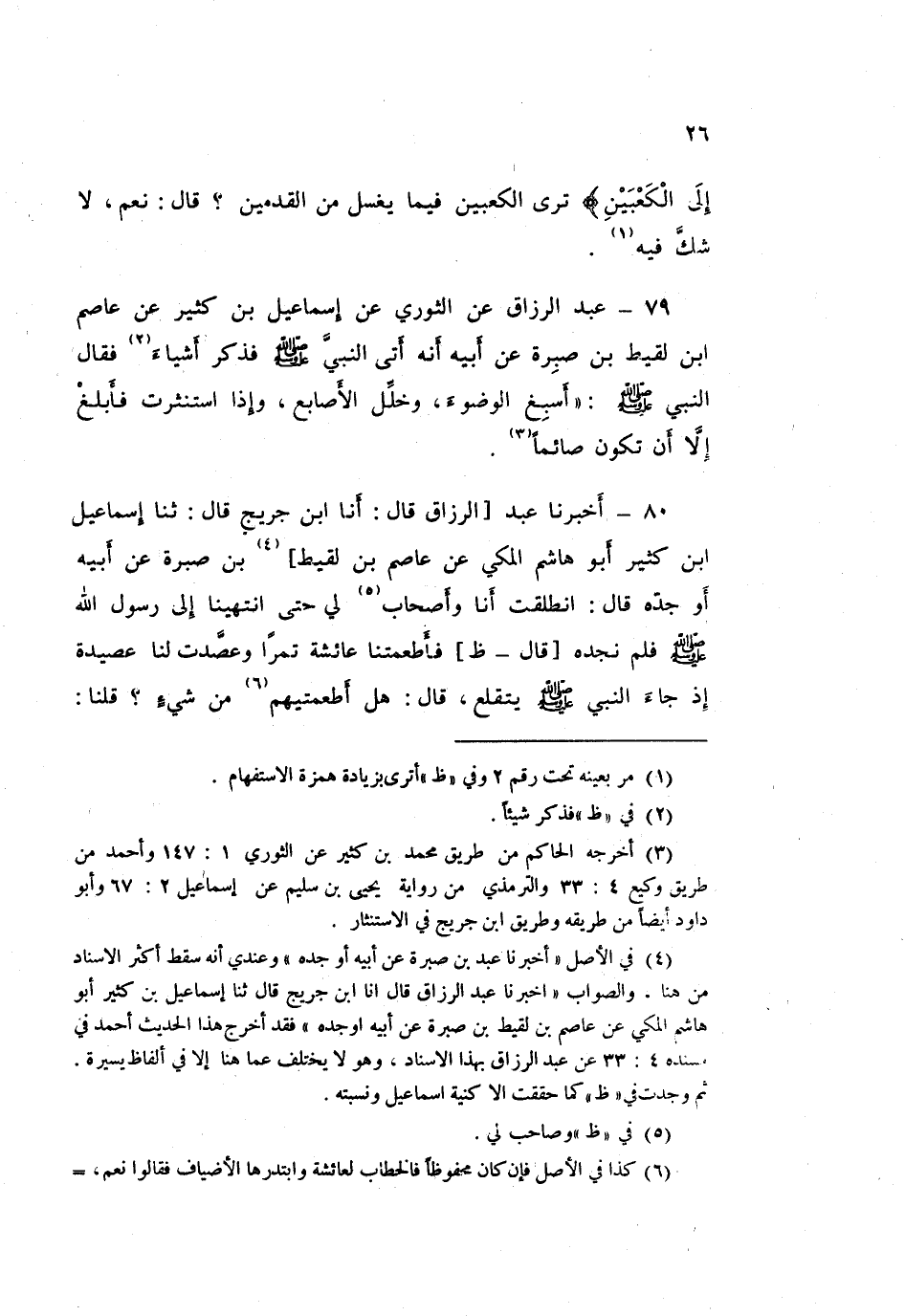 80 - أَخْبَرَنَا عَبْدُ الرَّزَّاقِ قَالَ: أنا ابْنُ جُرَيْجٍ قَالَ: ثنا إِسْمَاعِيلُ بْنُ كَثِيرٍ أَبُو هَاشِمٍ الْمَكِّيُّ، عَنْ عَاصِمِ بْنِ لَقِيطِ بْنِ صَبِرَةَ، عَنْ أَبِيهِ، أَوْ جَدِّهِ قَالَ: انْطَلَقْتُ أَنَا وَأَصْحَابٌ لِي حَتَّى انْتَهَيْنَا إِلَى رَسُولِ اللَّهِ صَلَّى اللهُ عَلَيْهِ وَسَلَّمَ فَلَمْ نَجِدْهُ قَالَ: فَأَطْعَمَتْنَا عَائِشَةُ تَمْرًا وَعَصَدَتْ لَنَا عَصِيدَةً، إِذْ جَاءَ النَّبِيُّ صَلَّى اللهُ عَلَيْهِ وَسَلَّمَ يَتَقَلَّعُ قَالَ: «هَلْ أَطْعَمْتِيهِمْ مِنْ شَيْءٍ؟» قُلْنَا -[27]-: نَعَمْ، فَبَيْنَا نَحْنُ عَلَى ذَلِكَ دَفَعَ الرَّاعِي الْغَنَمَ فِي الْمَرَاحِ عَلَى يَدِهِ سَخْلَةٌ قَالَ: «هَلْ وَلَّدْتَ؟» قَالَ: نَعَمْ. قَالَ: «فَاذْبَحْ لَهُمْ شَاةً، ثُمَّ أَقْبِلْ عَلَيْنَا». فَقَالَ: لَا تَحْسَبَنَّ وَلَمْ يَقُلْ لَا تَحْسِبَنَّ أَنَّا ذَبَحْنَا الشَّاةَ مِنْ أَجْلِكُمْ، لَنَا غَنَمٌ مِائَةٌ لَا نُرِيدُ أَنْ تَزِيدَ عَلَيْهَا إِذَا وَلَّدَ الرَّاعِي لَنَا بَهْمَةً أَمَرْنَاهُ فَذَبَحَ شَاةً قَالَ: قُلْتُ: يَا رَسُولَ اللَّهِ أَخْبِرْنِي عَنِ الْوُضُوءِ قَالَ: «§إِذَا تَوَضَّأْتَ فَأَسْبِغْ، وَخَلِّلْ بَيْنَ الْأَصَابِعِ، وَإِذَا اسْتَنْثَرْتَ فَأَبْلِغْ إِلَّا أَنْ تَكُونَ صَائِمَا» قَالَ: قُلْتُ: يَا رَسُولَ اللَّهِ إِنَّ لِي امْرَأَةً فَذَكَرَ مِنْ طُولِ لِسَانِهَا وَبَذَائِهَا، فَقَالَ: «طَلِّقْهَا» قَالَ: قُلْتُ: يَا رَسُولَ اللَّهِ، إِنَّهَا ذَاتُ صُحْبَةٍ وَوَلَدٍ قَالَ: «أَمْسِكْهَا وَأْمُرْهَا فَإِنْ يَكُنْ فِيهَا خَيْرٌ فَسَتَفْعَلُ وَلَا تَضْرِبْ ظَعِينَتَكَ ضَرْبَكَ أَمَتِكَ»