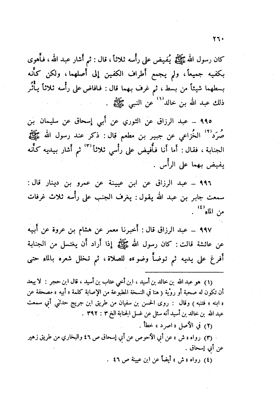 995 - عَبْدُ الرَّزَّاقِ، عَنِ الثَّوْرِيِّ، عَنْ أَبِي إِسْحَاقَ، عَنْ سُلَيْمَانَ بْنِ صُرَدٍ الْخُزَاعِيِّ، عَنْ جُبَيْرِ بْنِ مُطْعِمٍ قَالَ: ذُكِرَ عِنْدَ رَسُولِ اللَّهِ صَلَّى اللهُ عَلَيْهِ وَسَلَّمَ §الْجَنَابَةُ فَقَالَ: «أَمَّا أَنَا فَأُفِيضُ عَلَى رَأْسِي ثَلَاثًا»، ثُمَّ أَشَارَ بِيَدَيْهِ كَأَنَّهُ يُفِيضُ بِهِمَا عَلَى الرَّأْسِ