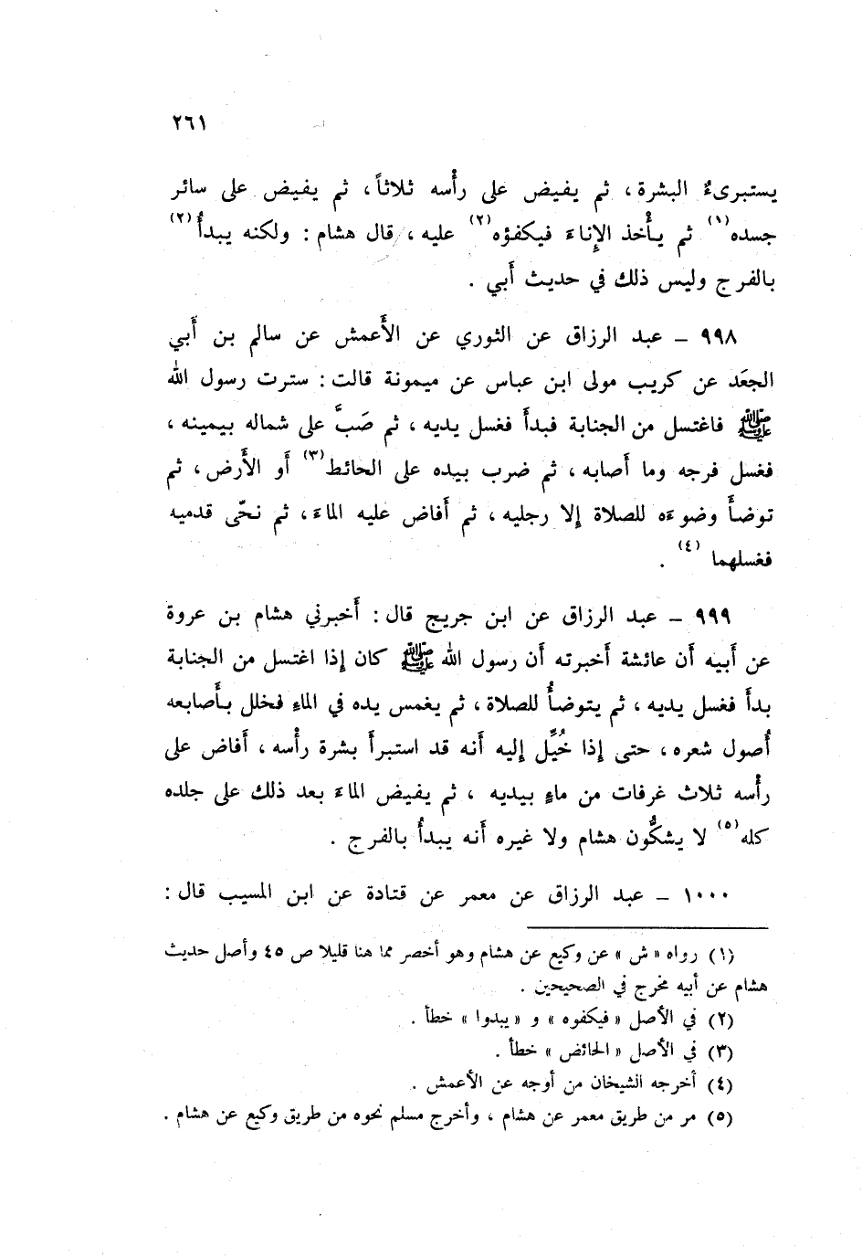 999 - عَبْدُ الرَّزَّاقِ، عَنِ ابْنِ جُرَيْجٍ قَالَ: أَخْبَرَنِي هِشَامُ بْنُ عُرْوَةَ، عَنْ أَبِيهِ، أَنَّ عَائِشَةَ أَخْبَرَتْهُ: أَنَّ رَسُولَ اللَّهِ صَلَّى اللهُ عَلَيْهِ وَسَلَّمَ كَانَ «§إِذَا اغْتَسَلَ مِنَ الْجَنَابَةِ بَدَأَ فَغَسَلَ يَدَيْهِ، ثُمَّ يَتَوَضَّأُ لِلصَّلَاةِ، ثُمَّ يَغْمِسُ يَدَهُ فِي الْمَاءِ فَخَلَّلَ بِأَصَابِعِهِ أُصُولَ شَعْرِهِ، حَتَّى إِذَا خُيِّلَ إِلَيْهِ أَنَّهُ قَدِ اسْتَبْرَأَ بَشَرَةَ رَأْسِهِ أَفَاضَ عَلَى رَأْسِهِ ثَلَاثَ غَرَفَاتٍ مِنْ مَاءٍ بِيَدَيْهِ، ثُمَّ يُفِيضُ الْمَاءَ بَعْدَ ذَلِكَ عَلَى جِلْدِهِ كُلِّهِ». «لَا يَشُكُّونَ هِشَامٌ وَلَا غَيْرُهُ أَنَّهُ يَبْدَأُ بِالْفَرْجِ»