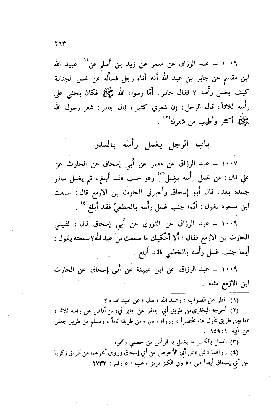1008 - عَبْدُ الرَّزَّاقِ، عَنِ الثَّوْرِيِّ، عَنْ أَبِي إِسْحَاقَ قَالَ: لَقِيَنِي الْحَارِثُ بْنُ الْأَزْمَعِ، فَقَالَ: أَلَا أَحْكِيكَ مَا سَمِعْتُ مِنْ عَبْدِ اللَّهِ؟ سَمِعْتُهُ يَقُولُ: «§أَيُّمَا جُنُبٍ غَسَلَ رَأْسَهُ بِالْخِطْمِيِّ فَقَدْ أَبْلَغَ»