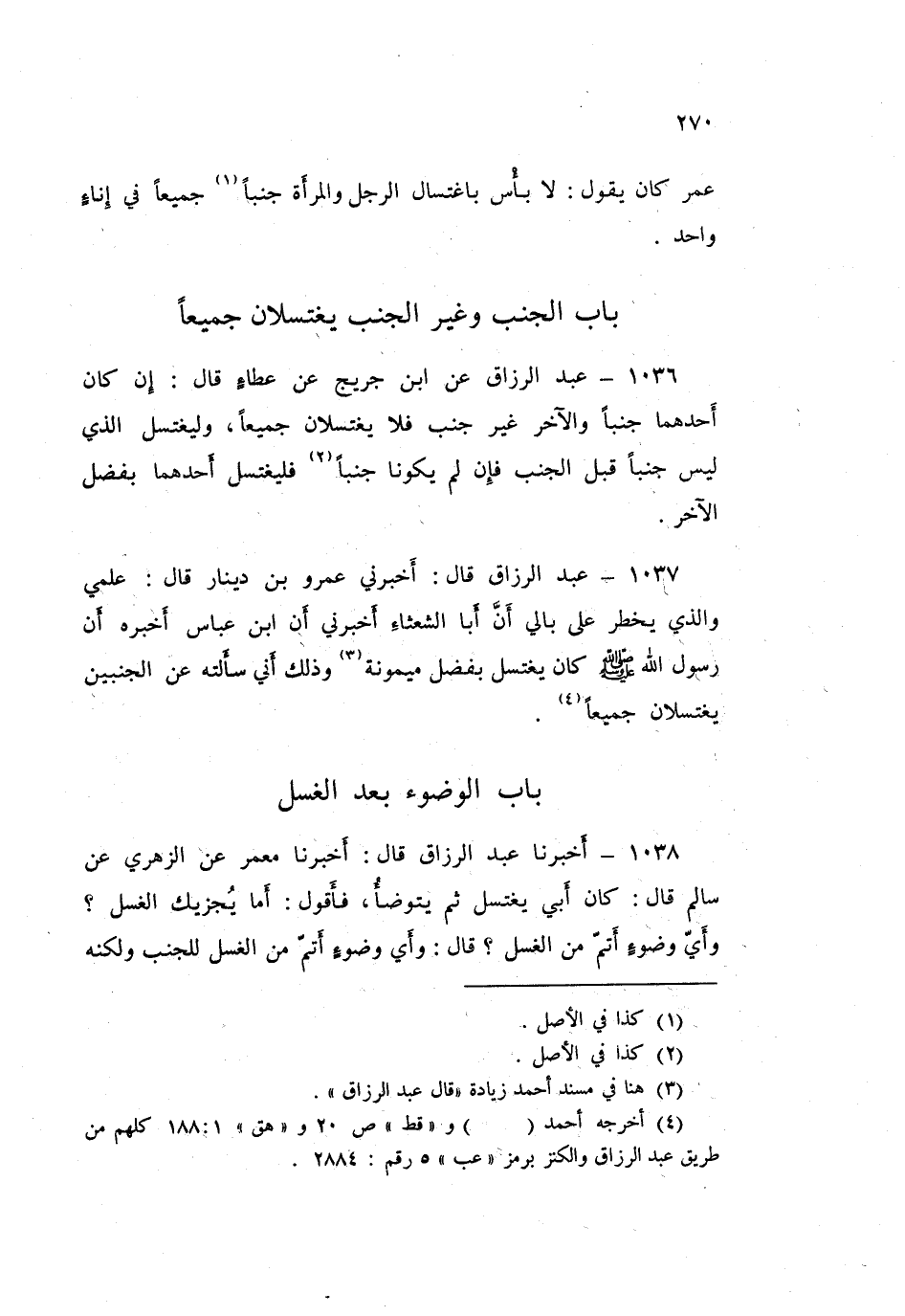 1036 - عَبْدُ الرَّزَّاقِ، عَنِ ابْنِ جُرَيْجٍ، عَنْ عَطَاءٍ قَالَ: «§إِنْ كَانَ أَحَدُهُمَا جُنُبًا وَالْآخَرُ غَيْرَ جُنُبٍ فَلَا يَغْتَسِلَانِ جَمِيعًا، وَلْيَغْتَسِلِ الَّذِي لَيْسَ جُنُبًا قَبْلَ الْجُنُبِ، فَإِنْ لَمْ يَكُونَا جُنُبًا فَلْيَغْتَسِلْ أَحَدُهُمَا بِفَضْلِ الْآخَرِ»
