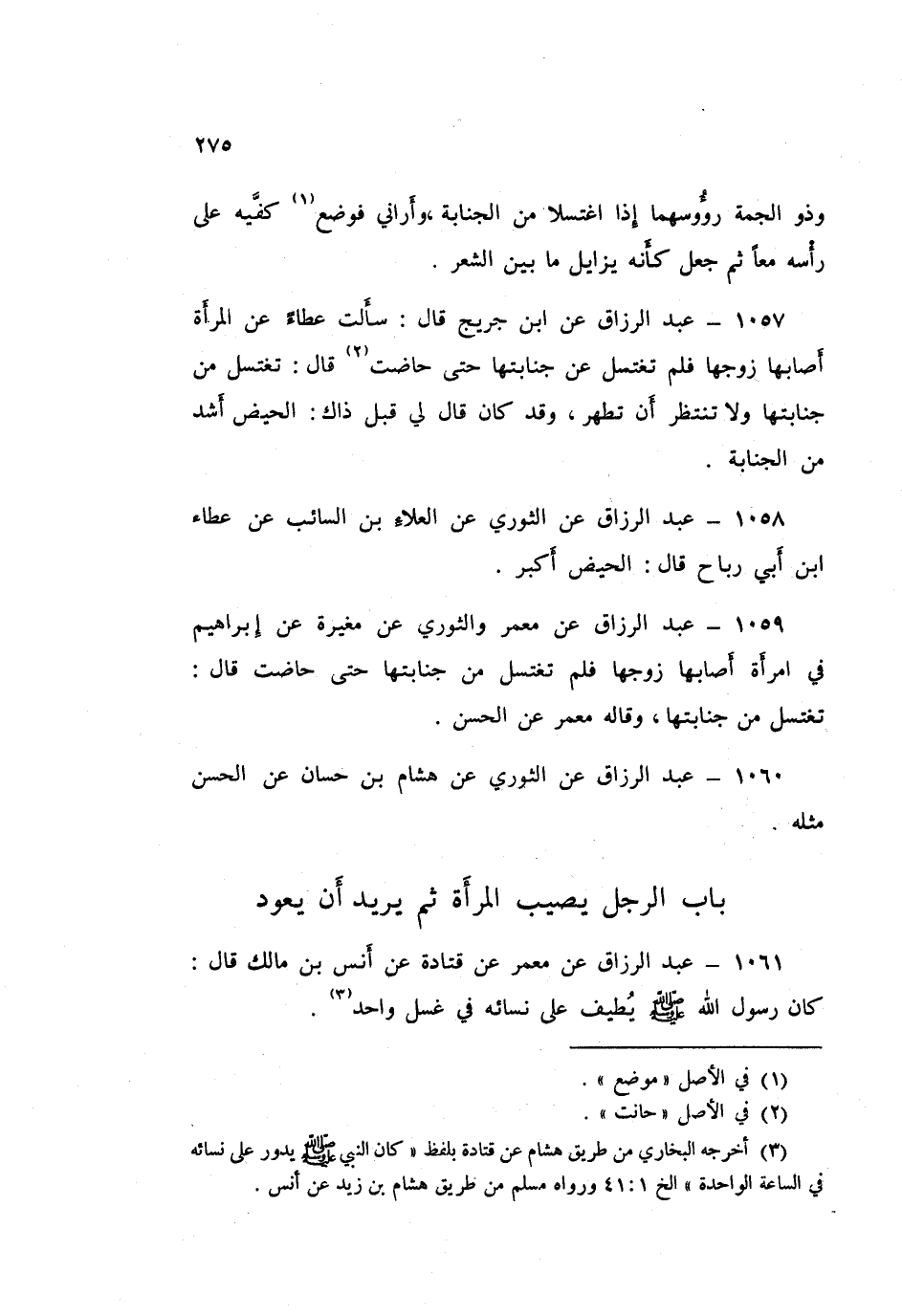 1061 - عَبْدُ الرَّزَّاقِ، عَنْ مَعْمَرٍ، عَنْ قَتَادَةَ، عَنْ أَنَسِ بْنِ مَالِكٍ قَالَ: «كَانَ رَسُولُ اللَّهِ صَلَّى اللهُ عَلَيْهِ وَسَلَّمَ §يُطِيفُ عَلَى نِسَائِهِ فِي غُسْلٍ وَاحِدٍ»