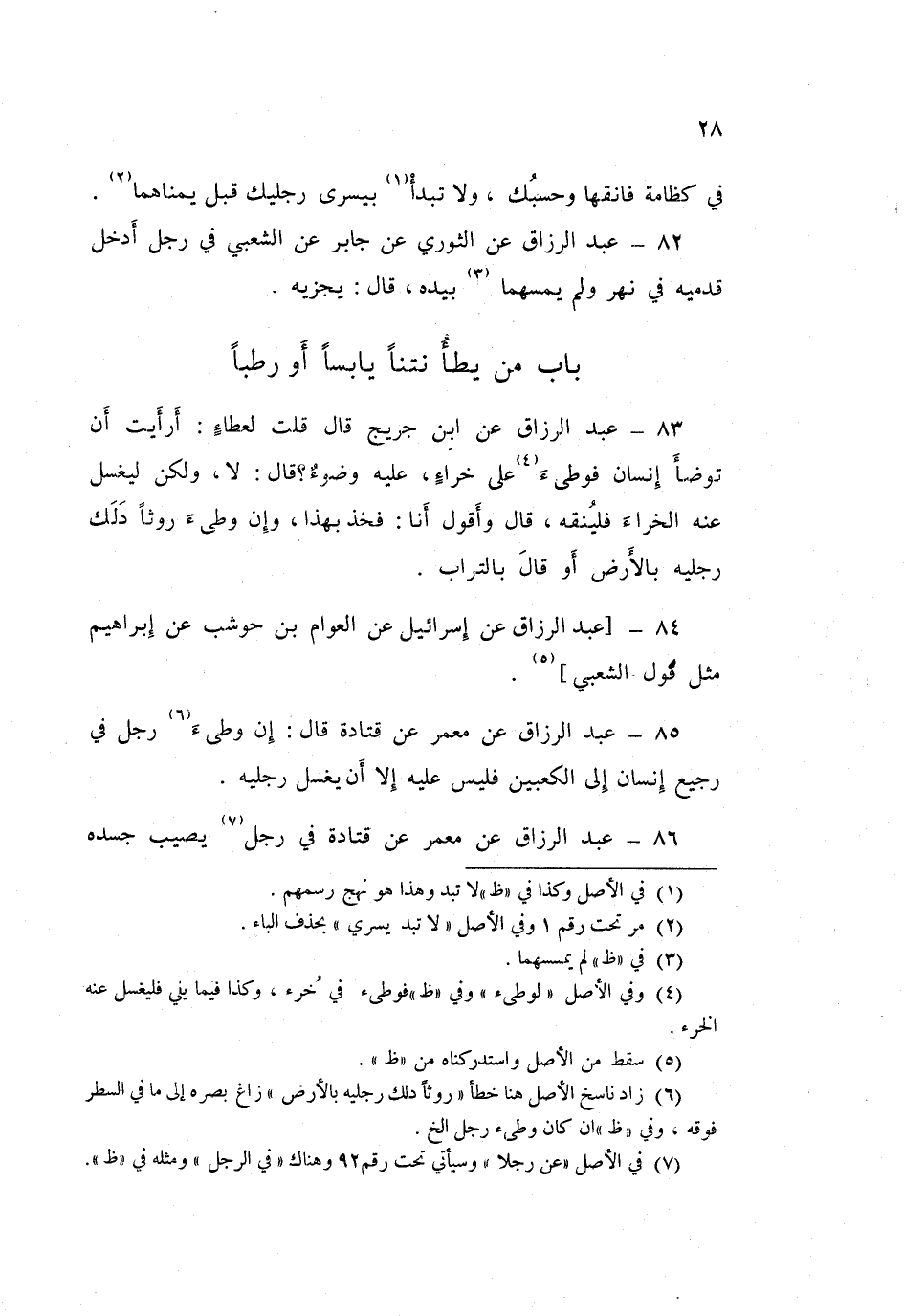 85 - عَبْدُ الرَّزَّاقِ، عَنْ مَعْمَرٍ، عَنْ قَتَادَةَ قَالَ: «§إِنْ وَطِئَ رَجُلٌ فِي رَجِيعِ إِنْسَانٍ إِلَى الْكَعْبَيْنِ فَلَيْسَ عَلَيْهِ إِلَّا أَنْ يَغْسِلَ رِجْلَيْهِ»