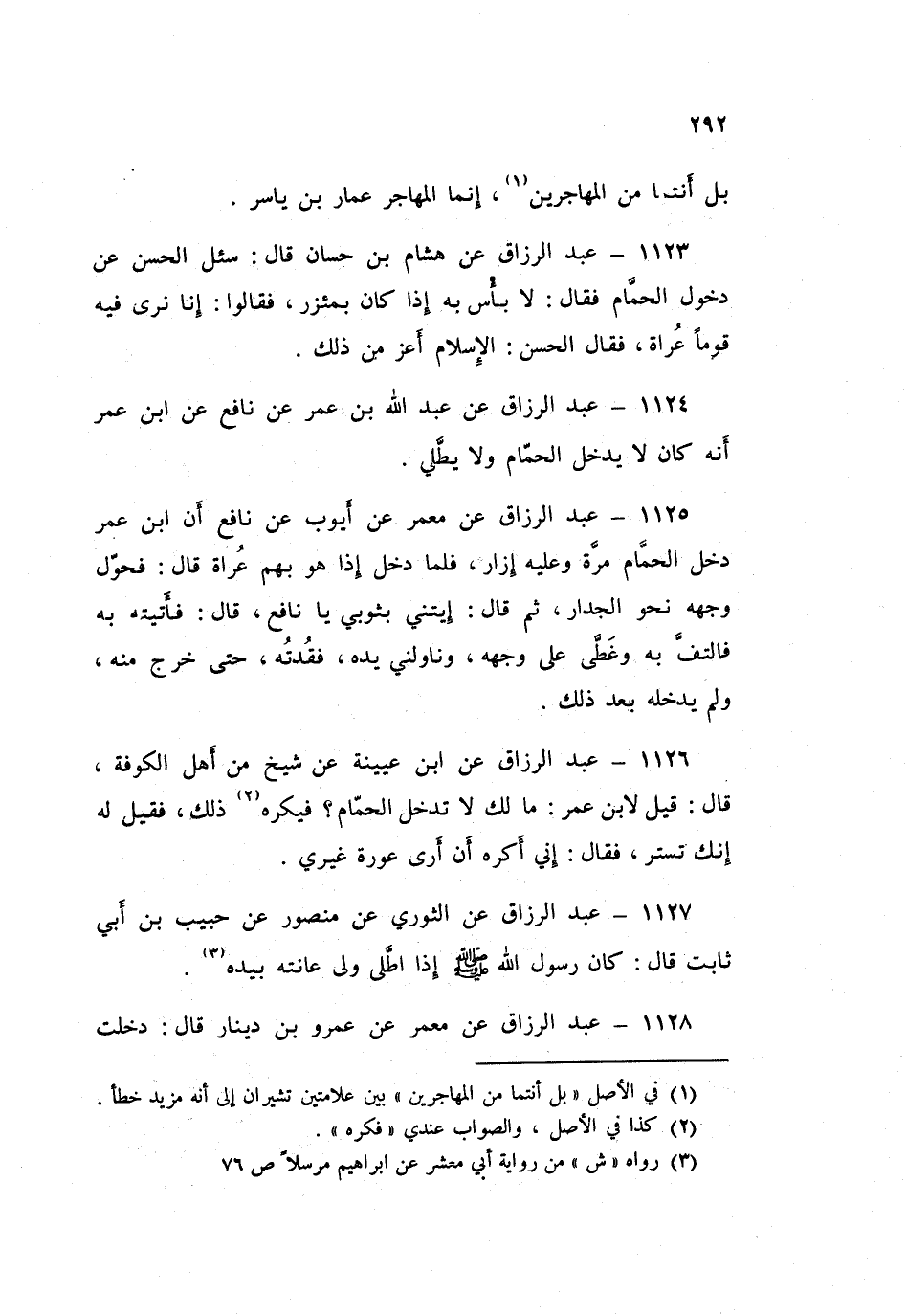 1125 - عَبْدُ الرَّزَّاقِ، عَنْ مَعْمَرٍ، عَنْ أَيُّوبَ، عَنْ نَافِعٍ، أَنَّ ابْنَ عُمَرَ §دَخَلَ الْحَمَّامَ مَرَّةً وَعَلَيْهِ إِزَارٌ فَلَمَّا دَخَلَ إِذَا هُوَ بِهِمْ عُرَاةً قَالَ: فَحَوَّلَ وَجْهَهُ نَحْوَ الْجِدَارِ ثُمَّ قَالَ: «ائْتِنِي بِثَوْبِي يَا نَافِعُ» قَالَ: فَأَتَيْتُهُ بِهِ فَالْتَفَّ بِهِ، وَغَطَّى عَلَى وَجْهِهِ، وَنَاوَلَنِي يَدَهُ فَقُدْتُهُ حَتَّى خَرَجَ مِنْهُ وَلَمْ يَدْخُلْهُ بَعْدَ ذَلِكَ