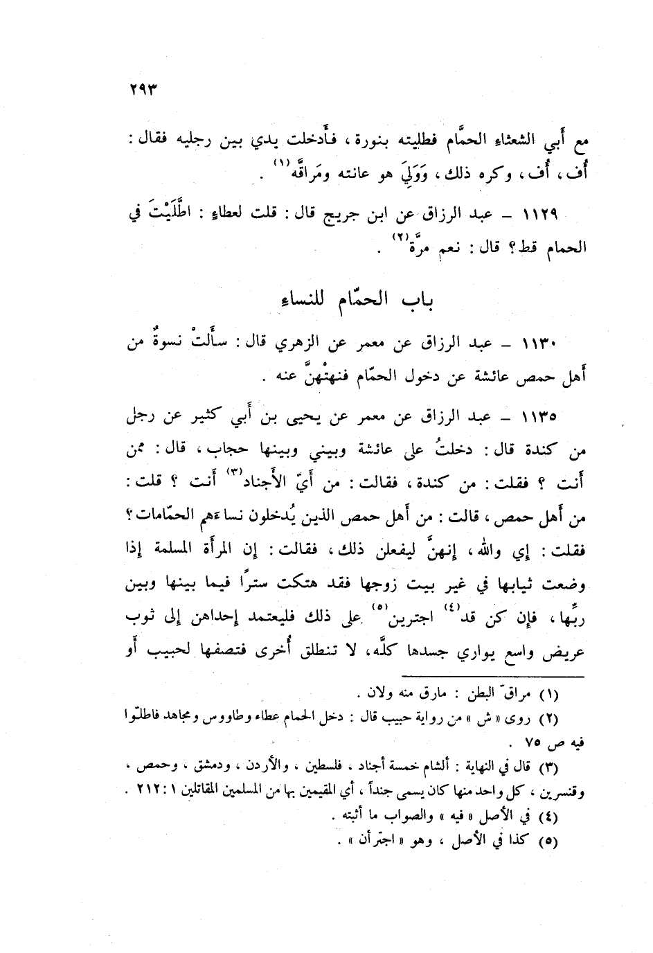 1130 - عَبْدُ الرَّزَّاقِ، عَنْ مَعْمَرٍ، عَنِ الزُّهْرِيِّ قَالَ: سَأَلَتْ نِسْوَةٌ مِنْ أَهْلِ حِمْصٍ عَائِشَةَ عَنْ دُخُولِ الْحَمَّامِ «§فَنَهَتْهُنَّ عَنْهُ»