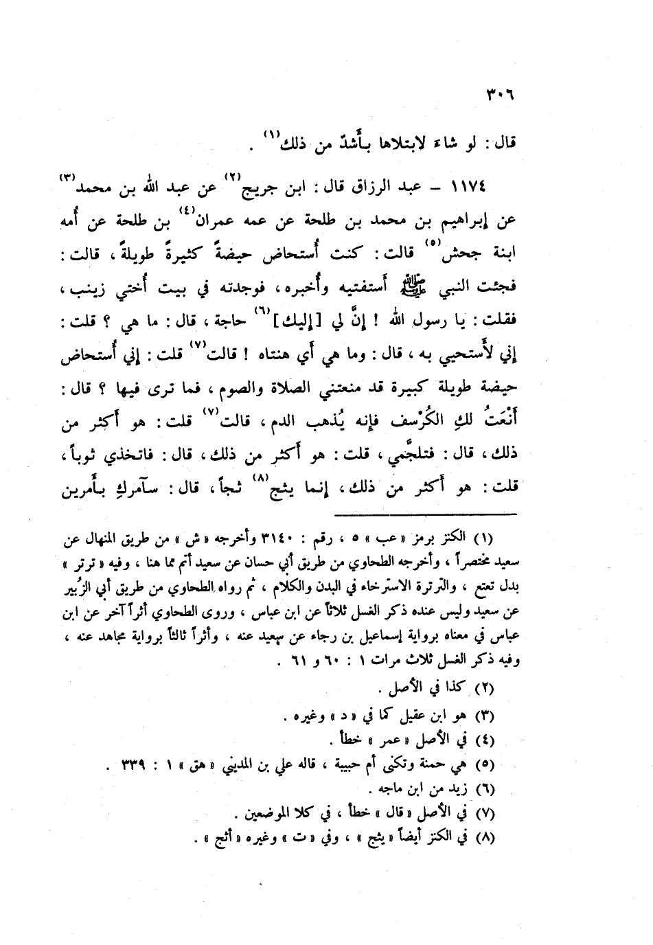 1174 - عَبْدُ الرَّزَّاقِ، قَالَ ابْنُ جُرَيْجٍ: عَنْ عَبْدِ اللَّهِ بْنِ مُحَمَّدٍ، عَنْ إِبْرَاهِيمَ بْنِ مُحَمَّدِ بْنِ طَلْحَةَ، عَنْ عَمِّهِ عِمْرَانَ بْنِ طَلْحَةَ، عَنْ أُمِّهِ ابْنةِ جَحْشٍ قَالَتْ: كُنْتُ أُسْتَحَاضُ حَيْضَةً كَثِيرَةً طَوِيلَةً قَالَتْ: فَجِئْتُ النَّبِيَّ صَلَّى اللهُ عَلَيْهِ وَسَلَّمَ أَسْتَفْتِيهِ وَأُخْبِرُهُ فَوَجَدْتُهُ فِي بَيْتِ أُخْتِي زَيْنَبَ، فَقُلْتُ: يَا رَسُولَ اللَّهِ إِنَّ لِي إِلَيْكَ حَاجَةً قَالَ: «مَا هِيَ؟» قُلْتُ: إِنِّي لَأَسْتَحْيِي بِهِ قَالَ: «وَمَا هِيَ أَيْ هَنْتَاهُ؟» قَالَتْ: قُلْتُ: إِنِّي أُسْتَحَاضُ حَيْضَةً طَوِيلَةً كَبِيرَةً قَدْ مَنَعَتْنِي الصَّلَاةَ وَالصَّوْمَ فَمَا تَرَى فِيهَا؟ قَالَ: «أَنْعَتُ لَكِ الْكُرْسُفَ فَإِنَّهُ يُذْهِبُ الدَّمَ» قَالَتْ: قُلْتُ: هُوَ أَكْثَرُ مِنْ ذَلِكَ قَالَ: «فَتَلَجَّمِي»، قُلْتُ: هُوَ أَكْثَرُ مِنْ ذَلِكَ قَالَ: «فَاتَّخِذِي ثَوْبًا»، قُلْتُ: هُوَ أَكْثَرُ مِنْ ذَلِكَ، إِنَّمَا يَثُجُّ ثَجًّا قَالَ: «سَآمُرُكِ بِأَمْرَيْنِ -[307]- بِأَيِّهِمَا فَعَلْتِ فَقَدْ أَجْزَأَكَ اللَّهُ مِنَ الْآخَرِ فَإِنْ قَوِيتِ عَلَيْهِمَا فَأَنْتِ أَعْلَمُ» وَقَالَ: «إِنَّمَا هَذِهِ رَكْضَةٌ مِنْ رَكَضَاتِ الشَّيْطَانِ» قَالَ: «§فَتَحِيضِي سِتَّةَ أَيَّامٍ أَوْ سَبْعَةً فِي عِلْمِ اللَّهِ، ثُمَّ اغْتَسِلِي حَتَّى إِذَا رَأَيْتِ أَنَّكَ قَدْ طَهُرْتِ وَاسْتَيْقَنْتِ فَصَلِّي أَرْبَعَةً وَعِشْرِينَ لَيْلَةً وَأَيَّامَهَا وَصُومِي، فَإِنَّ ذَلِكَ يُجْزِيكِ وَكَذَلِكَ فَافْعَلِي فِي كُلِّ شَهْرٍ كَمَا تَحِيضُ النِّسَاءُ وَيَطْهُرْنَ لِمِيقَاتِ حَيْضِهِنَّ وَطُهْرِهِنَّ، وَإِنْ قَوِيتِ عَلَى أَنْ تُؤَخِّرِي الظُّهْرَ وَتُعَجِّلِي الْعَصْرَ فَتَغْتَسِلِي لَهُمَا جَمِيعَا، ثُمَّ تُؤَخِّرِي الْمَغْرِبَ وَتُعَجِّلِينَ الْعِشَاءَ فَتَغْتَسِلَينَ لَهُمَا وَتَجْمَعِينَ بَيْنَ الصَّلَاتَيْنِ، وَتَغْتَسِلِينَ مَعَ الْفَجْرِ، ثُمَّ تُصَلِّينَ وَكَذَلِكَ فَافْعَلِي وَصُومِي إِنْ قَوِيتِ عَلَى ذَلِكَ»، قَالَ رَسُولُ اللَّهِ صَلَّى اللهُ عَلَيْهِ وَسَلَّمَ: «وَهَذَا أَعْجَبُ الْأَمْرَيْنِ إِلَيَّ». قَالَ عَبْدُ الرَّزَّاقِ: " تَلَجَّمِي: يَعْنِي تَسْتَثْفِرُ "
