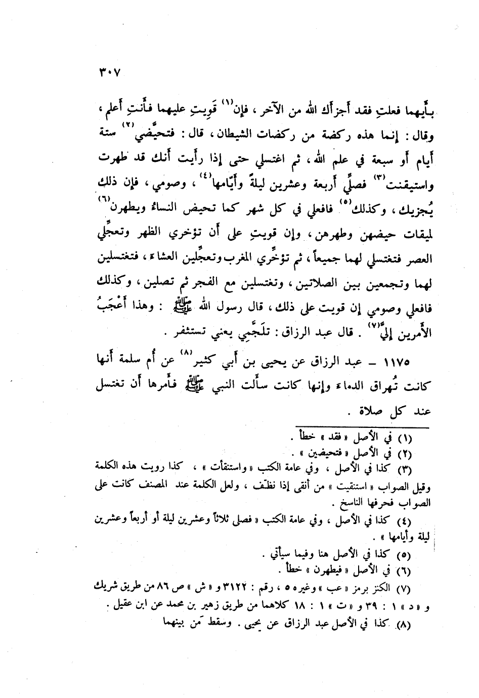 1175 - عَبْدُ الرَّزَّاقِ، عَنْ يَحْيَى بْنِ أَبِي كَثِيرٍ، عَنْ أُمِّ سَلَمَةَ: «أَنَّهَا كَانَتْ تُهْرَاقُ الدِّمَاءَ وَأَنَّهَا كَانَتْ سَأَلَتِ النَّبِيَّ صَلَّى اللهُ عَلَيْهِ وَسَلَّمَ، فَأَمَرَهَا أَنْ §تَغْتَسِلَ عِنْدَ كُلِّ صَلَاةٍ»
