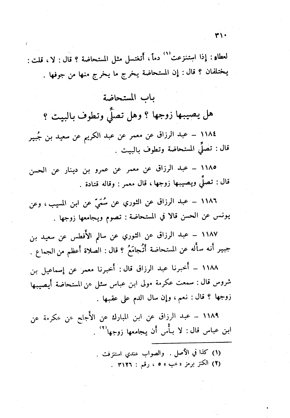 1187 - عَبْدُ الرَّزَّاقِ، عَنِ الثَّوْرِيِّ، عَنْ سَالِمٍ الْأَفْطَسِ، عَنْ سَعِيدِ بْنِ جُبَيْرٍ، أَنَّهُ سَأَلَهُ عَنِ §الْمُسْتَحَاضَةِ أَتُجَامَعُ؟ قَالَ: «الصَّلَاةُ أَعْظَمُ مِنَ الْجِمَاعِ»