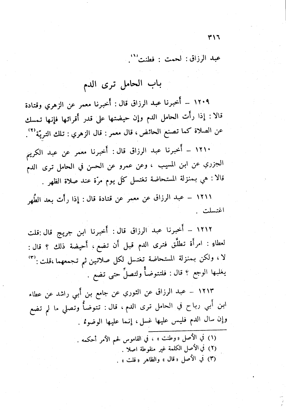 1209 - أَخْبَرَنَا عَبْدُ الرَّزَّاقِ قَالَ: أَخْبَرَنَا مَعْمَرٌ، عَنِ الزُّهْرِيِّ، وَقَتَادَةَ قَالَا: «§إِذَا رَأَتِ الْحَامِلُ الدَّمَ وَإَنَّ حَيْضَتَهَا عَلَى قَدْرِ أَقْرَائِهَا فَإِنَّهَا تَمْسِكُ عَنِ الصَّلَاةِ كَمَا تَصْنَعُ الْحَائِضُ» قَالَ مَعْمَرٌ: قَالَ الزُّهْرِيُّ: تِلْكَ التَّرِيَّةُ