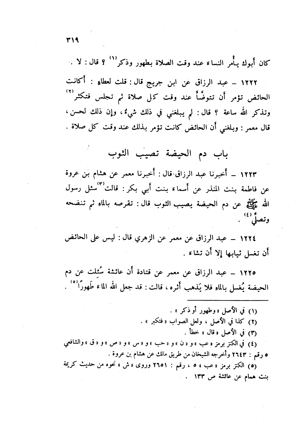 1224 - عَبْدُ الرَّزَّاقِ، عَنْ مَعْمَرٍ، عَنِ الزُّهْرِيِّ قَالَ: «§لَيْسَ عَلَى الْحَائِضِ أَنْ تَغْسِلَ ثِيَابَهَا إِلَّا أَنْ تَشَاءَ»