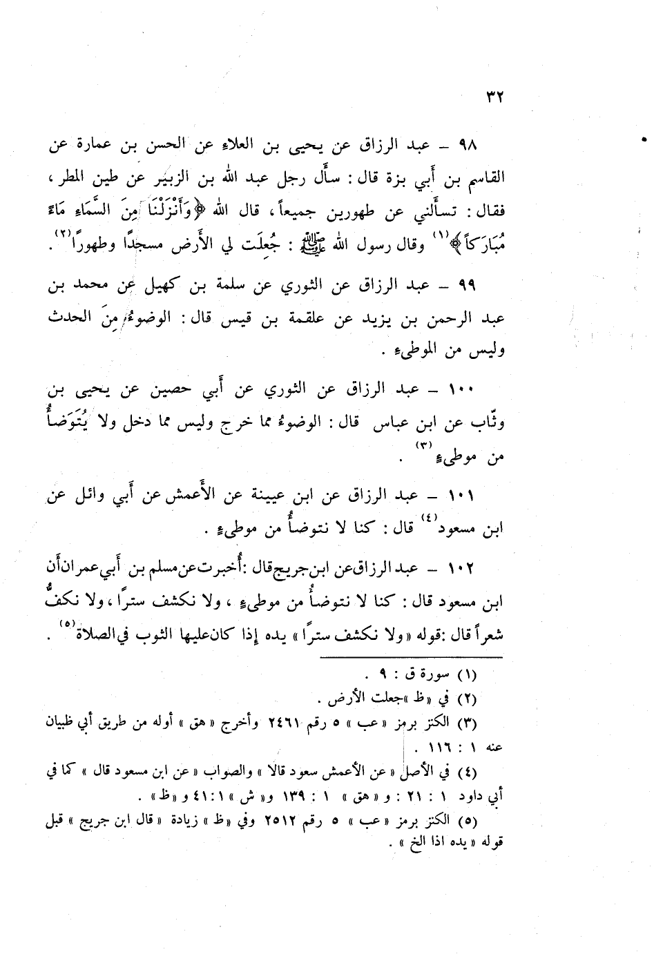 101 - عَبْدُ الرَّزَّاقِ، عَنِ ابْنِ عُيَيْنَةَ، عَنِ الْأَعْمَشِ، عَنْ أَبِي وَائِلٍ، عَنِ ابْنِ مَسْعُودٍ قَالَ: «كُنَّا §لَا نَتَوَضَّأُ مِنْ مَوْطِئٍ»