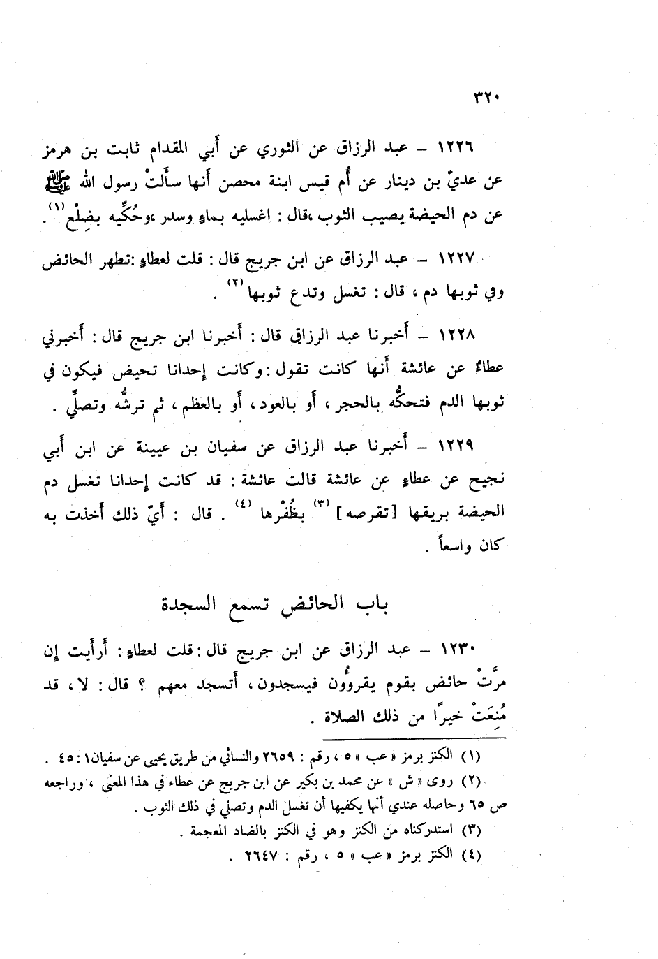 1227 - عَبْدُ الرَّزَّاقِ، عَنِ ابْنِ جُرَيْجٍ قَالَ: قُلْتُ لِعَطَاءٍ: §تَطْهُرُ الْحَائِضُ وَفِي ثَوْبِهَا دَمٌ؟ قَالَ: «تَغْسِلُ وَتَدَعُ ثَوْبَهَا»