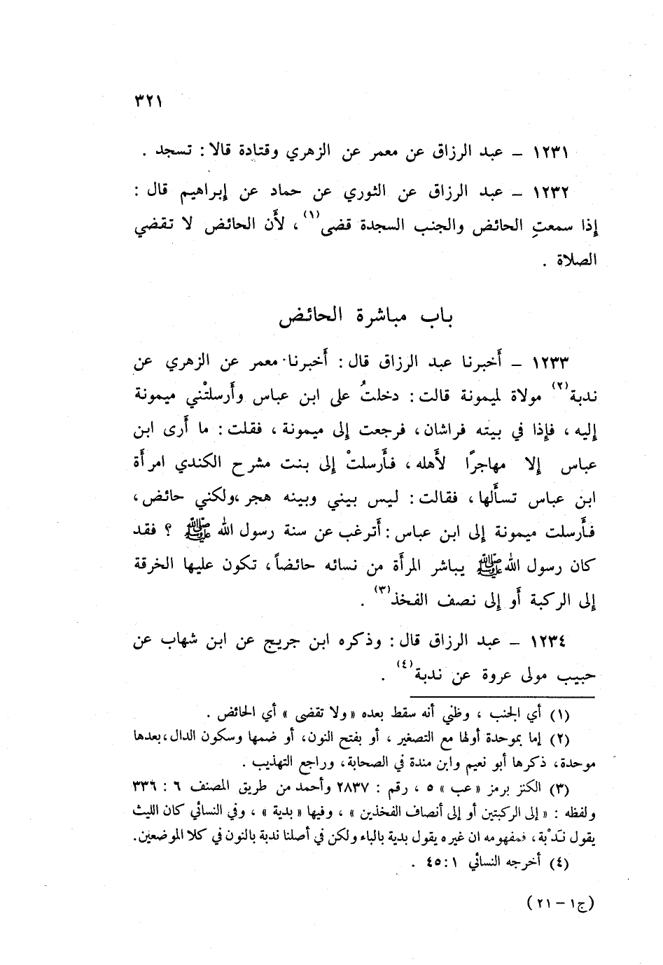 1233 - أَخْبَرَنَا عَبْدُ الرَّزَّاقِ قَالَ: أَخْبَرَنَا مَعْمَرٌ، عَنِ الزُّهْرِيِّ، عَنْ نُدْبَةَ، مَوْلَاةٍ لِمَيْمُونَةَ قَالَتْ: دَخَلْتُ عَلَى ابْنِ عَبَّاسٍ وَأَرْسَلَتْنِي مَيْمُونَةُ إِلَيْهِ فَإِذَا فِي بَيْتِهِ فِرَاشَانِ، فَرَجَعْتُ إِلَى مَيْمُونَةَ فَقُلْتُ: مَا أَرَى ابْنَ عَبَّاسٍ إِلَّا مُهَاجِرًا لِأَهْلِهِ، فَأَرْسَلَتْ إِلَى بِنْتِ مِشْرَحٍ الْكِنْدِيِّ امْرَأَةِ ابْنِ عَبَّاسٍ تَسْأَلُهَا، فَقَالَتْ: لَيْسَ بَيْنِي وَبَيْنَهُ هَجْرٌ، وَلَكِنِّي حَائِضٌ فَأَرْسَلَتْ مَيْمُونَةُ إِلَى ابْنِ عَبَّاسٍ: «أَتَرْغَبُ عَنْ سُنَّةِ رَسُولِ اللَّهِ صَلَّى اللهُ عَلَيْهِ وَسَلَّمَ؟ فَقَدْ كَانَ رَسُولُ اللَّهِ صَلَّى اللهُ عَلَيْهِ وَسَلَّمَ» §يُبَاشِرُ الْمَرْأَةَ مِنْ نِسَائِهِ حَائِضًا تَكُونُ عَلَيْهَا الْخِرْقَةُ إِلَى الرُّكْبَةِ، أَوْ إِلَى نِصْفِ الْفَخِذِ ".