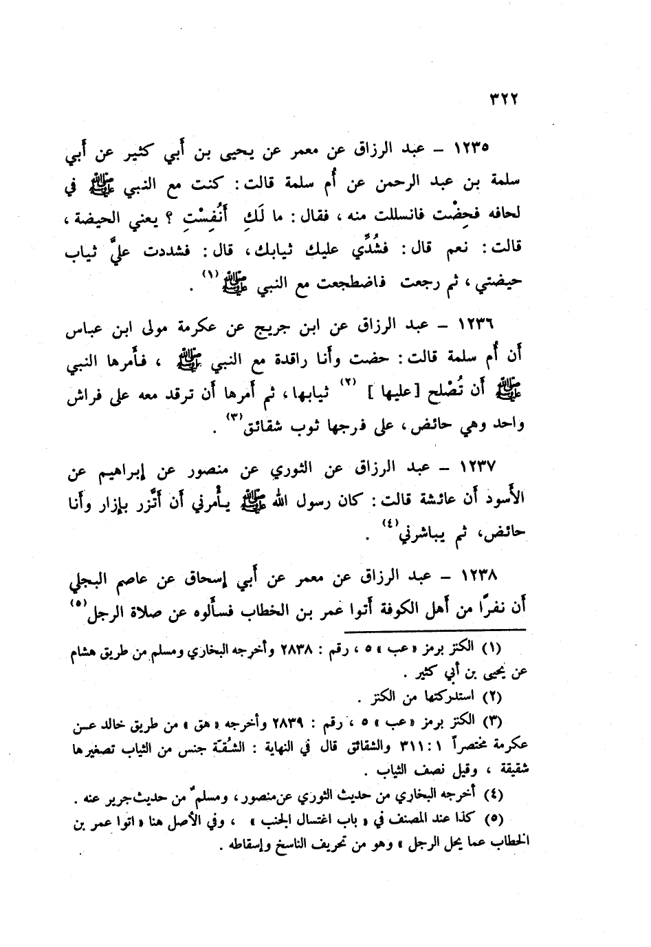 1235 - عَبْدُ الرَّزَّاقِ، عَنْ مَعْمَرٍ، عَنْ يَحْيَى بْنِ أَبِي كَثِيرٍ، عَنْ أَبِي سَلَمَةَ بْنِ عَبْدِ الرَّحْمَنِ، عَنْ أُمِّ سَلَمَةَ قَالَتْ: كُنْتُ مَعَ النَّبِيِّ صَلَّى اللهُ عَلَيْهِ وَسَلَّمَ فِي لِحَافِهِ فَحِضْتُ فَانْسَلَلْتُ مِنْهُ، فَقَالَ: «§مَا لَكِ أَنُفِسْتِ؟» - يَعْنِي الْحَيْضَةَ - قَالَتْ: نَعَمْ قَالَ: «فَشُدِّي عَلَيْكَ ثِيَابَكِ» قَالَتْ: فَشَدَدْتُ عَلَيَّ ثِيَابَ حَيْضَتِي، ثُمَّ رَجَعْتُ فَاضْطَجَعْتُ مَعَ النَّبِيِّ صَلَّى اللهُ عَلَيْهِ وَسَلَّمَ