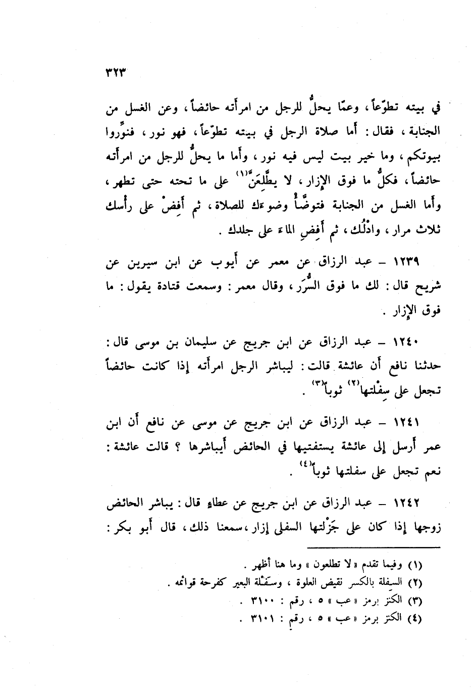 1242 - عَبْدُ الرَّزَّاقِ، عَنِ ابْنِ جُرَيْجٍ، عَنْ عَطَاءٍ قَالَ: «§يُبَاشِرُ الْحَائِضَ زَوْجُهَا إِذَا كَانَ عَلَى جَزْلَتِهَا السُّفْلَى إِزَارٌ سَمِعْنَا ذَلِكَ». قَالَ أَبُو بَكْرٍ: «جَزْلَتُهَا مِنَ السُّرَّةِ إِلَى الرُّكْبَةِ»