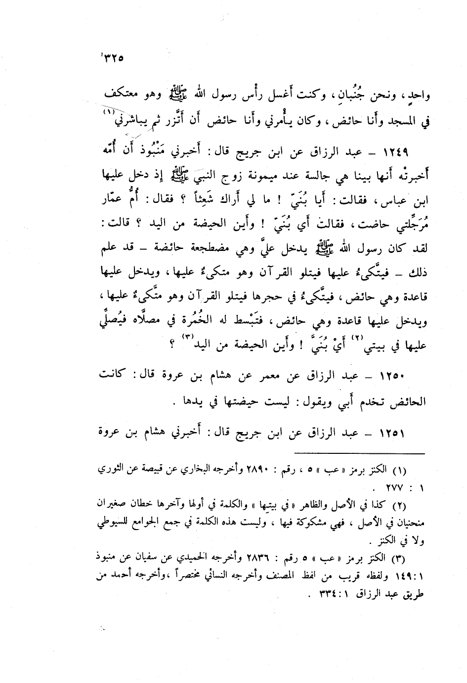 1249 - عَبْدُ الرَّزَّاقِ، عَنِ ابْنِ جُرَيْجٍ قَالَ: أَخْبَرَنِي مَنْبُوذٌ، أَنَّ أُمَّهُ، أَخْبَرَتْهُ، أَنَّهَا بَيْنَا هِيَ جَالِسَةٌ عِنْدَ مَيْمُونَةَ زَوْجِ النَّبِيِّ صَلَّى اللهُ عَلَيْهِ وَسَلَّمَ، إِذْ دَخَلَ عَلَيْهَا ابْنُ عَبَّاسٍ فَقَالَتْ: «أَيَا بُنَيَّ مَا لِي أَرَاكَ شَعِثًا؟» فَقَالَ: أُمُّ عَمَّارٍ مُرَجِّلَتِي حَاضَتْ، فَقَالَتْ: «أَيْ بُنَيَّ، وَأَيْنَ الْحَيْضَةُ مِنَ الْيَدِ» قَالَتْ: «لَقَدْ كَانَ رَسُولُ اللَّهِ صَلَّى اللهُ عَلَيْهِ وَسَلَّمَ §يَدْخُلُ عَلَيَّ وَهِيَ مُضْطَجِعَةٌ حَائِضَةٌ قَدْ عَلِمَ ذَلِكَ فَيَتَّكِئُ عَلَيْهَا فَيَتْلُو الْقُرْآنَ وَهُوَ مُتَّكِئٌ عَلَيْهَا، وَيَدْخُلُ عَلَيْهَا قَاعِدَةً وَهِيَ حَائِضٌ فَيَتَّكِئُ فِي حِجْرِهَا فَيَتْلُو الْقُرْآنَ وَهُوَ مُتَّكِئٌ عَلَيْهَا، وَيَدْخُلُ عَلَيْهَا قَاعِدَةً وَهِيَ حَائِضٌ فَتَبْسُطُ لَهُ الْخُمُرَةَ فِي مُصَلَّاهِ فَيُصَلِّي عَلَيْهَا فِي بَيْتِي، أَيْ بُنَيَّ وَأَيْنَ الْحَيْضَةُ مِنَ الْيَدِ»