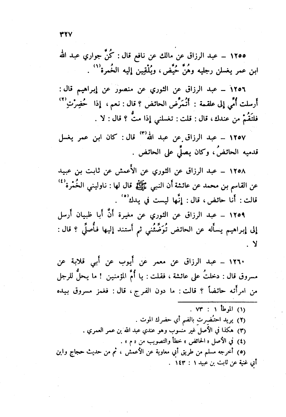 1259 - عَبْدُ الرَّزَّاقِ، عَنِ الثَّوْرِيِّ، عَنْ مُغِيرَةَ، أَنَّ أَبَا ظَبْيَانَ أَرْسَلَ إِلَى إِبْرَاهِيمَ يَسْأَلُهُ، عَنِ §الْحَائِضِ تُوَضِّئُنِي، ثُمَّ أَسْتَنِدُ إِلَيْهَا فَأُصَلِّي قَالَ: «لَا»