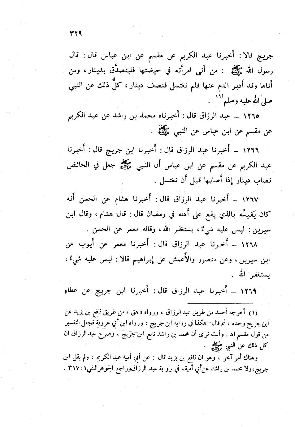 1266 - أَخْبَرَنَا عَبْدُ الرَّزَّاقِ قَالَ: أَخْبَرَنَا ابْنُ جُرَيْجٍ قَالَ: أَخْبَرَنَا عَبْدُ الْكَرِيمِ، عَنْ مِقْسَمٍ، عَنِ ابْنِ عَبَّاسٍ، أَنَّ النَّبِيَّ صَلَّى اللهُ عَلَيْهِ وَسَلَّمَ «§جَعَلَ فِي الْحَائِضِ نِصَابَ دِينَارٍ إِذَا أَصَابَهَا قَبْلَ أَنْ تَغْتَسِلَ»