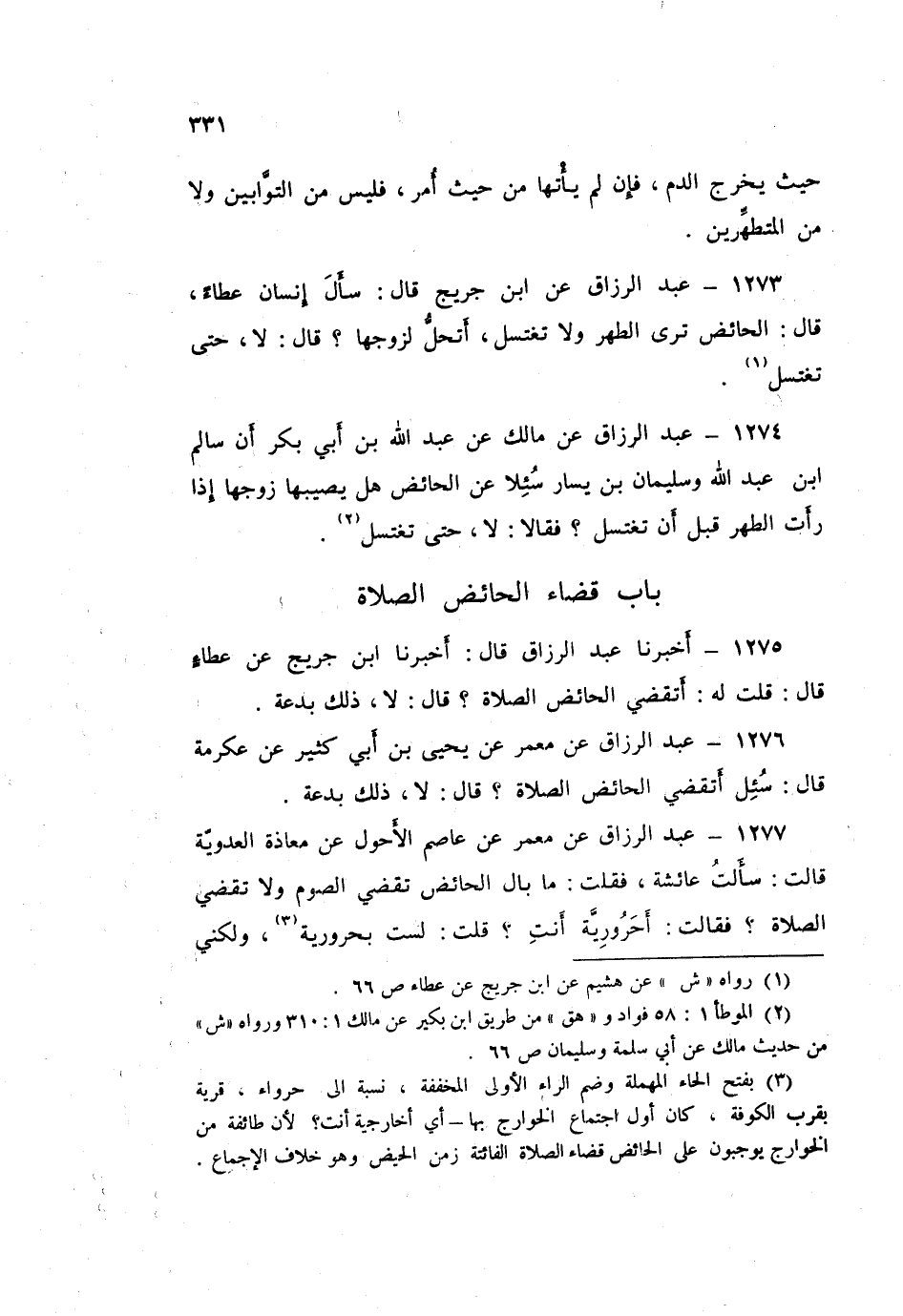 1277 - عَبْدُ الرَّزَّاقِ، عَنْ مَعْمَرٍ، عَنْ عَاصِمٍ الْأَحْوَلِ، عَنْ مُعَاذَةَ الْعَدَوِيَّةِ قَالَتْ: سَأَلْتُ عَائِشَةَ، فَقُلْتُ: مَا بَالُ الْحَائِضِ تَقْضِي الصَّوْمَ وَلَا تَقْضِي الصَّلَاةَ؟ فَقَالَتْ: «أَحَرُورِيَّةٌ أَنْتِ؟» قُلْتُ: لَسْتُ بِحَرُورِيَّةٍ، وَلَكِنِّي أَسْأَلُ قَالَتْ: «قَدْ كَانَ §يُصِيبُنَا ذَلِكَ مَعَ رَسُولِ اللَّهِ صَلَّى اللهُ عَلَيْهِ وَسَلَّمَ فَنُؤْمَرُ بِقَضَاءِ الصَّوْمِ، وَلَا نُؤْمَرُ بِقَضَاءِ الصَّلَاةِ».