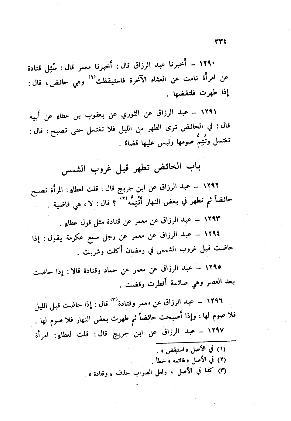 1290 - أَخْبَرَنَا عَبْدُ الرَّزَّاقِ قَالَ: أَخْبَرَنَا مَعْمَرٌ، قَالَ: سُئِلَ قَتَادَةُ، عَنِ §امْرَأَةٍ نَامَتْ عَنِ الْعِشَاءِ الْآخِرَةِ، فَاسْتَيْقَظَتْ وَهِيَ حَائِضٌ قَالَ: «إِذَا طَهُرَتْ فَلْتَقْضِهَا»