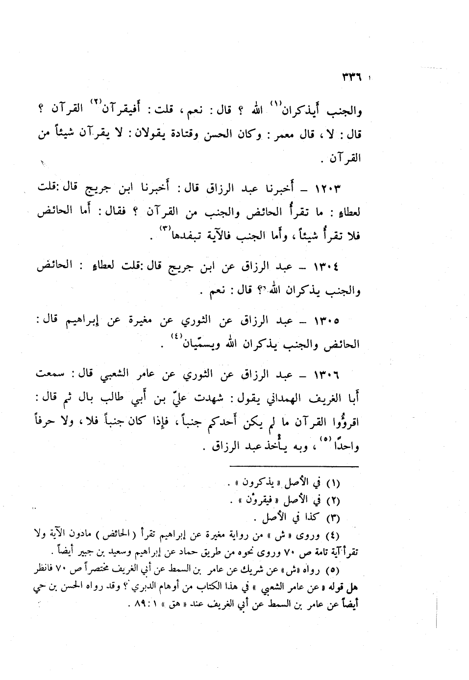 1306 - عَبْدُ الرَّزَّاقِ، عَنِ الثَّوْرِيِّ، عَنْ عَامِرٍ الشَّعْبِيِّ قَالَ: سَمِعْتُ أَبَا الْغَرِيفِ الْهَمْدَانِيَّ يَقُولُ: شَهِدْتُ عَلِيَّ بْنَ أَبِي طَالِبٍ بَالَ، ثُمَّ قَالَ: «§اقْرَءُوَا الْقُرْآنَ مَا لَمْ يَكُنْ أَحَدُكُمْ جُنُبًا، فَإِذَا كَانَ جُنُبًا فَلَا وَلَا حَرْفًا وَاحِدًا». وَبِهِ يَأْخُذُ عَبْدُ الرَّزَّاقِ