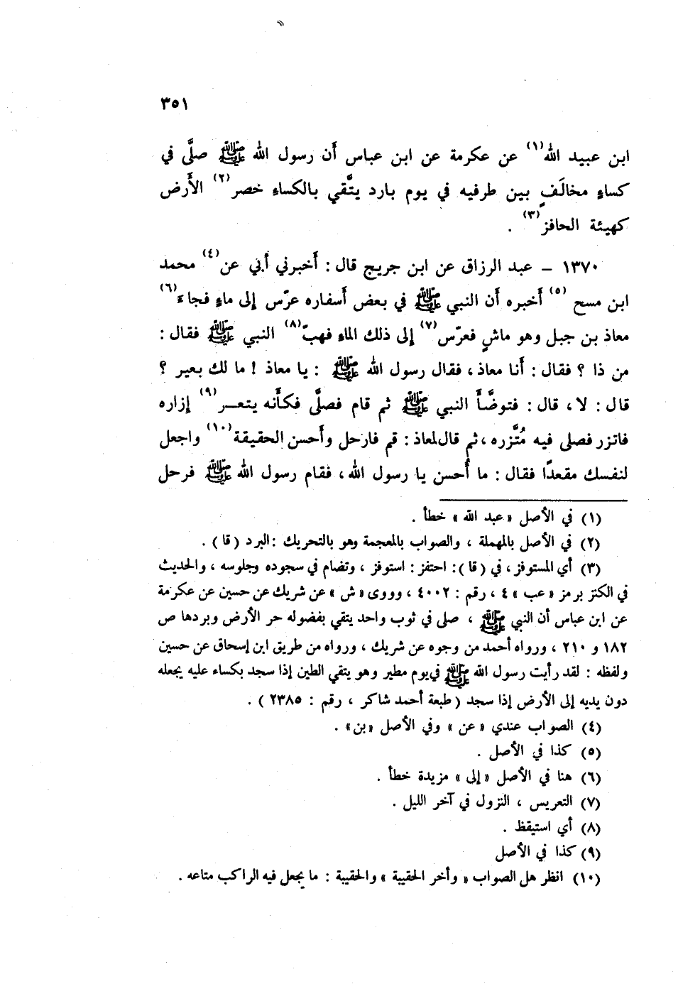 1370 - عَبْدُ الرَّزَّاقِ، عَنِ ابْنِ جُرَيْجٍ قَالَ: أَخْبَرَنِي أَبِي، عَنْ مُحَمَّدِ بْنِ مَسْحٍ، أَخْبَرَهُ، أَنَّ النَّبِيَّ صَلَّى اللهُ عَلَيْهِ وَسَلَّمَ فِي بَعْضِ أَسْفَارِهِ عَرَّسَ إِلَى مَاءٍ فَجَاءَ مُعَاذُ بْنُ جَبَلٍ وَهُوَ مَاشٍ فَعَرَّسَ إِلَى ذَلِكَ الْمَاءِ فَهَبَّ النَّبِيُّ صَلَّى اللهُ عَلَيْهِ وَسَلَّمَ فَقَالَ: «مَنْ ذَا؟» فَقَالَ: أَنَا مُعَاذٌ، فَقَالَ رَسُولُ اللَّهِ صَلَّى اللهُ عَلَيْهِ وَسَلَّمَ: «يَا مُعَاذُ §مَا لَكَ بَعِيرٌ؟» قَالَ: لَا قَالَ: فَتَوَضَّأَ النَّبِيُّ صَلَّى اللهُ عَلَيْهِ وَسَلَّمَ، ثُمَّ قَامَ فَصَلَّى فَكَأَنَّهُ يَتَعَرَّ إِزَارَهُ فَاتَّزَرَ فَصَلَّى فِي مُتَّزَرِهِ، ثُمَّ قَالَ لِمُعَاذٍ: «قُمْ فَارْحَلْ، وَأَحْسِنِ الْحَقِيقَةَ، وَاجْعَلْ لِنَفْسِكَ مِقْعَدًا» فَقَالَ: مَا أُحْسِنُ يَا رَسُولَ اللَّهِ، فَقَامَ رَسُولُ اللَّهِ صَلَّى اللهُ عَلَيْهِ وَسَلَّمَ فَرَحَلَ -[352]-، وَجَعَلَ لَهُ مَجْلِسًا وَأَرْدَفَهُ مَعَهُ