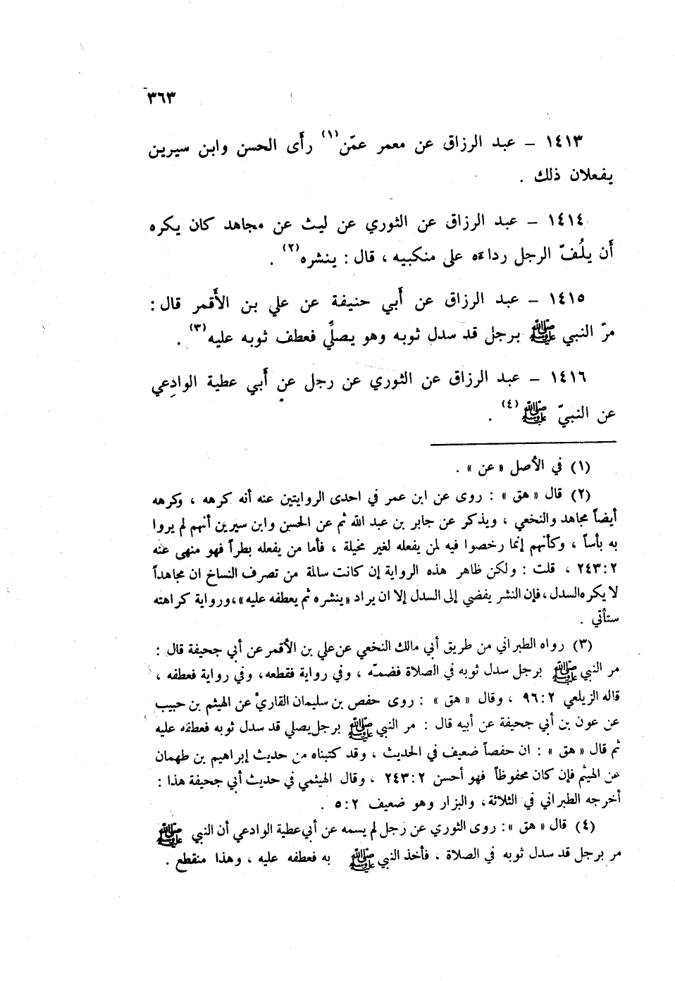 1415 - عَبْدُ الرَّزَّاقِ، عَنْ أَبِي حَنِيفَةَ، عَنْ عَلِيِّ بْنِ الْأَقْمَرِ قَالَ: «مَرَّ النَّبِيُّ صَلَّى اللهُ عَلَيْهِ وَسَلَّمَ بِرَجُلٍ قَدْ سَدَلَ ثَوْبَهُ وَهُوَ يُصَلِّي §فَعَطَفَ ثَوْبَهُ عَلَيْهِ».