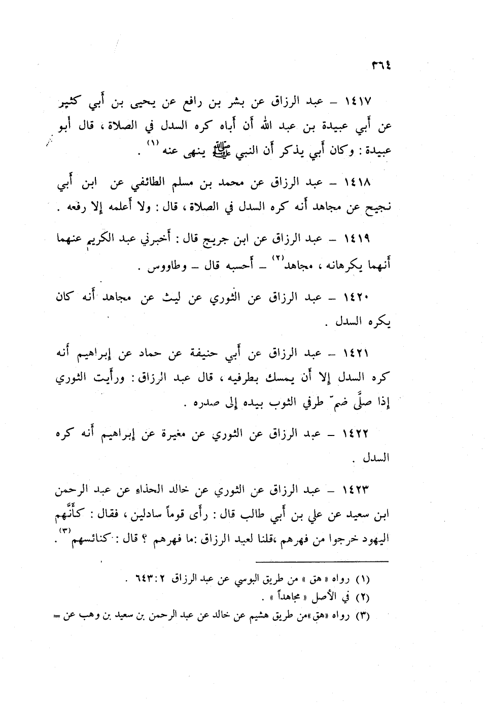1418 - عَبْدُ الرَّزَّاقِ، عَنْ مُحَمَّدِ بْنِ مُسْلِمٍ الْطَائِفِيِّ، عَنِ ابْنِ أَبِي نَجِيحٍ، عَنْ مُجَاهِدٍ: «أَنَّهُ §كَرِهَ السَّدْلَ فِي الصَّلَاةِ». قَالَ: وَلَا أَعْلَمُهُ إِلَّا رَفَعَهُ.