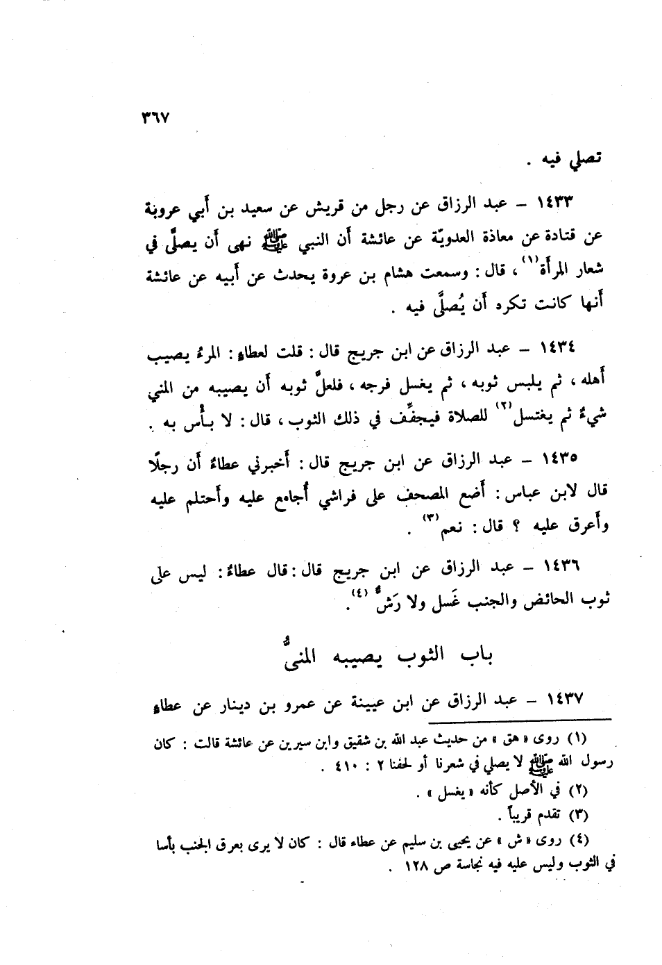 1436 - عَبْدُ الرَّزَّاقِ، عَنِ ابْنِ جُرَيْجٍ قَالَ: قَالَ عَطَاءٌ: «§لَيْسَ عَلَى ثَوْبِ الْحَائِضِ وَالْجُنُبِ غُسْلٌ، وَلَا رَشٌّ»