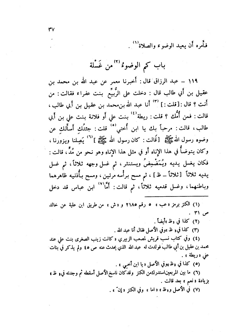 119 - عَبْدُ الرَّزَّاقِ، قَالَ: أَخْبَرَنَا مَعْمَرٌ، عَنْ عَبْدِ اللَّهِ بْنِ مُحَمَّدِ بْنِ عَقِيلِ بْنِ أَبِي طَالِبٍ قَالَ: دَخَلْتُ عَلَى الرُّبَيِّعِ بِنْتِ عَفْرَاءَ، فَقَالَتْ: مَنْ أَنْتَ؟ قَالَ: قُلْتُ: أَنَا عَبْدُ اللَّهِ بْنُ مُحَمَّدِ بْنِ عَقِيلِ بْنِ أَبِي طَالِبٍ قَالَتْ: فَمَنْ أُمُّكَ؟ قُلْتُ: رَيْطَةُ بِنْتُ عَلِيٍّ - أَوْ فُلَانَةُ بِنْتُ عَلِيِّ بْنِ أَبِي طَالِبٍ - قَالَتْ: مَرْحَبًا بِكَ يَا ابْنَ أُخْتِي قُلْتُ: جِئْتُكَ أَسْأَلُكَ عَنْ وُضُوءِ رَسُولِ اللَّهِ صَلَّى اللهُ عَلَيْهِ وَسَلَّمَ؟ قَالَتْ: كَانَ رَسُولُ اللَّهِ صَلَّى اللهُ عَلَيْهِ وَسَلَّمَ يَصِلُنَا وَيَزُورُنَا، وَكَانَ يَتَوَضَّأُ فِي هَذَا الْإِنَاءِ - أَوْ فِي مِثْلِ هَذَا الْإِنَاءِ - وَهُوَ نَحْوٌ مِنْ مُدٍّ قَالَتْ: «فَكَانَ §يَغْسِلُ يَدَيْهِ، وَيُمَضْمِضُ، وَيَسْتَنْثِرُ، ثُمَّ غَسَلَ وَجْهَهُ ثَلَاثًا، ثُمَّ غَسَلَ يَدَيْهِ ثَلَاثًا ثَلَاثًا، ثُمَّ مَسَحَ بِرَأْسِهِ مَرَّتَيْنِ، وَمَسَحَ بِأُذُنَيْهِ ظَاهِرِهِمَا وَبَاطِنِهِمَا، وَغَسَلَ قَدَمَيْهِ ثَلَاثًا». ثُمَّ قَالَتْ: أَمَّا ابْنُ عَبَّاسٍ قَدْ دَخَلَ -[38]- عَلَيَّ فَسَأَلَنِي، عَنْ هَذَا الْحَدِيثِ فَأَخْبَرْتُهُ، فَقَالَ: «يَأْبَى النَّاسُ إِلَّا الْغَسْلَ، وَنَجِدُ فِي كِتَابِ اللَّهِ الْمَسْحَ عَلَى الْقَدَمَيْنِ»
