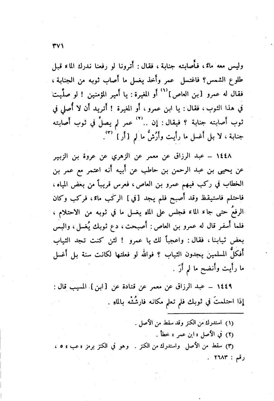 1448 - عَبْدُ الرَّزَّاقِ، عَنْ مَعْمَرٍ، عَنِ الزُّهْرِيِّ، عَنْ عُرْوَةَ بْنِ الزُّبَيْرِ، عَنْ يَحْيَى بْنِ عَبْدِ الرَّحْمَنِ بْنِ حَاطِبٍ، عَنْ أَبِيهِ: أَنَّهُ اعْتَمَرَ مَعَ عُمَرَ بْنِ الْخَطَّابِ فِي رَكْبٍ فِيهِمْ عَمْرُو بْنُ الْعَاصِ فَعَرَّسَ قَرِيبًا مِنْ بَعْضِ الْمِيَاهِ، فَاحْتَلَمَ فَاسْتَيْقَظَ وَقَدْ أَصْبَحَ فَلَمْ يَجِدْ فِي الرَّكْبِ مَاءً فَرَكِبَ، وَكَانَ الرَّفْعُ حَتَّى جَاءَ الْمَاءَ فَجَلَسَ عَلَى الْمَاءِ يَغْسِلُ مَا فِي ثَوْبِهِ مِنَ الِاحْتِلَامِ فَلَمَّا أَسْفَرَ، قَالَ لَهُ عَمْرُو بْنُ الْعَاصِ: أَصْبَحْتَ دَعْ ثَوْبَكَ يُغْسَلُ، وَالْبَسْ بَعْضَ ثِيَابِنَا فَقَالَ: «وَاعَجَبًا لَكَ يَا عَمْرُو لَئِنْ كُنْتَ تَجِدُ الثِّيَابَ أَفَكُلُّ الْمُسْلِمِينَ يَجِدُونَ الثِّيَابَ؟ فَوَاللَّهِ لَوْ فَعَلْتُهَا لَكَانَتْ سُنَّةً، بَلِ §أَغْسِلُ مَا رَأَيْتُ، وَأَنْضَحُ مَا لَمْ أَرَ»