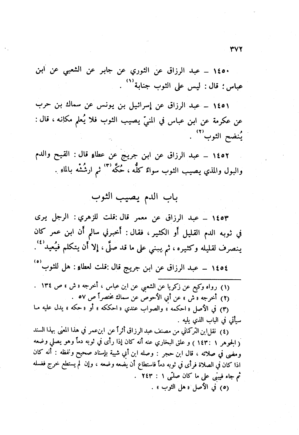 1453 - عَبْدُ الرَّزَّاقِ، عَنْ مَعْمَرٍ قَالَ: قُلْتُ لِلزُّهْرِيِّ: الرَّجُلُ يَرَى فِي ثَوْبِهِ الدَّمَ الْقَلِيلَ أَوِ الْكَثِيرَ فَقَالَ: أَخْبَرَنِي سَالِمٌ، أَنَّ ابْنَ عُمَرَ، كَانَ «§يَنْصَرِفُ لِقَلِيلِهِ وَكَثِيرِهِ، ثُمَّ يَبْنِي عَلَى مَا قَدْ صَلَّى إِلَّا أَنْ يَتَكَلَّمَ فَيُعِيدُ»