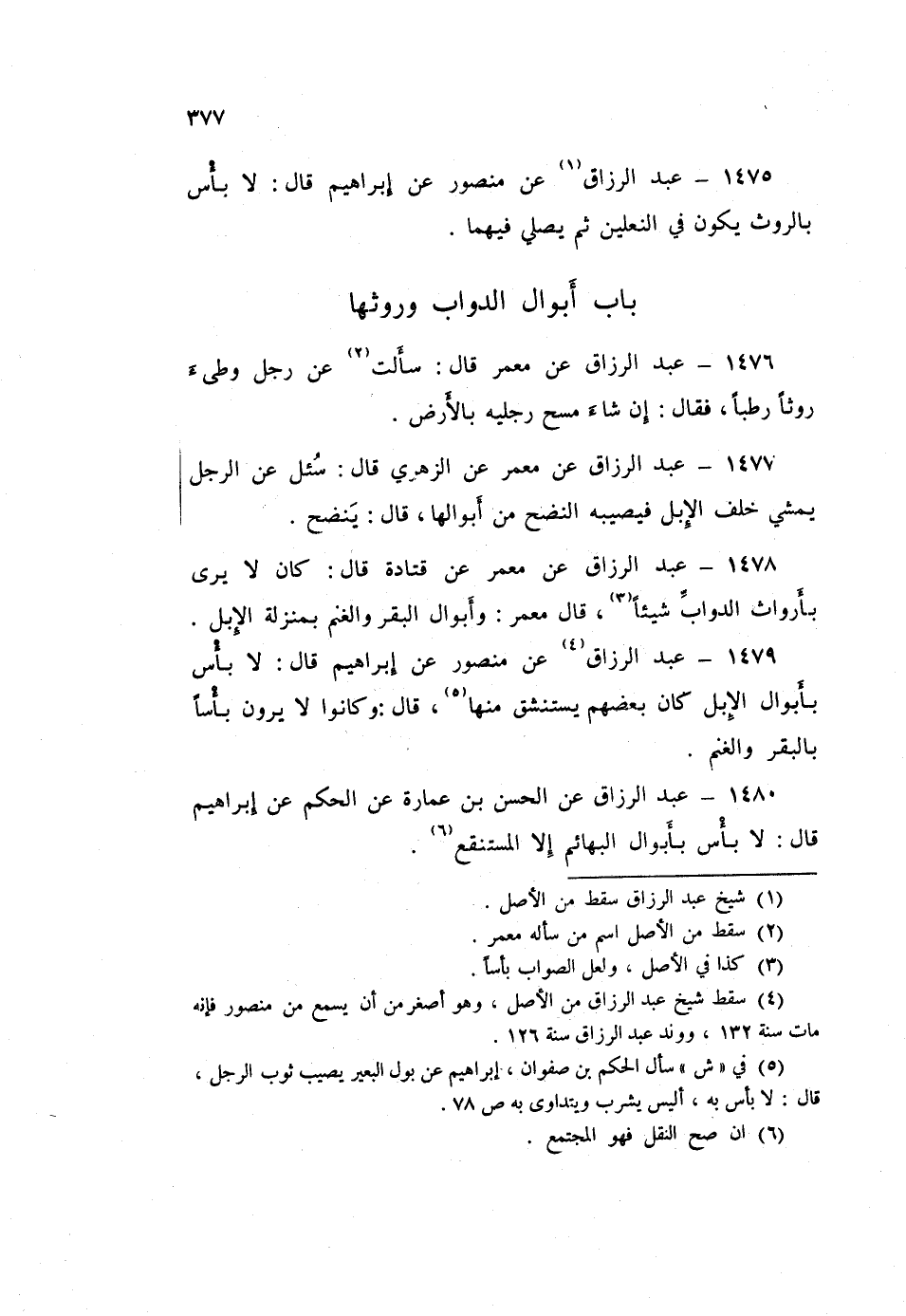 1477 - عَبْدُ الرَّزَّاقِ، عَنْ مَعْمَرٍ، عَنِ الزُّهْرِيِّ قَالَ: سُئِلَ عَنِ §الرَّجُلِ يَمْشِي خَلْفَ الْإِبِلِ فَيُصِيبُهُ النَّضْحُ مِنْ أَبْوَالِهَا قَالَ: «يَنْضَحُ»