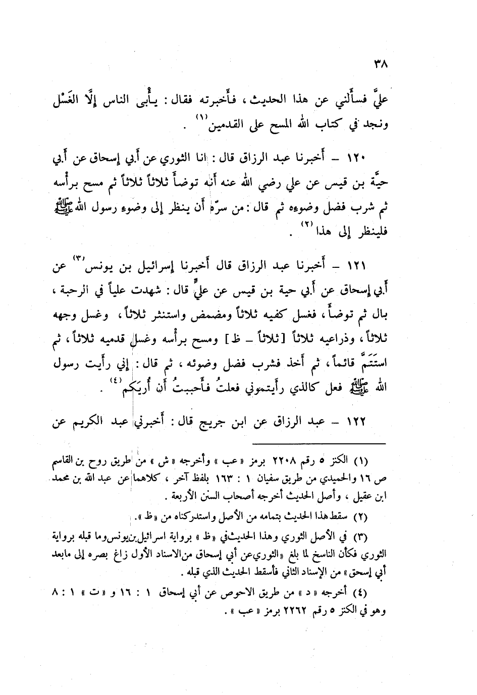 122 - عَبْدُ الرَّزَّاقِ، عَنِ ابْنِ جُرَيْجٍ قَالَ: أَخْبَرَنِي عَبْدُ الْكَرِيمِ، عَنِ -[39]- الْخَارِفِيِّ، أَنَّ عَلِيًّا بِالْكُوفَةِ، قَالَ لِخَادِمِهِ: يَا قُنْبُرُ أَبْغِنِي وَضُوءًا؟ فَجَاءَهُ بِهِ، قَالَ الْمُغِيرَةُ: عَنْ عَبْدِ الْكَرِيمِ فِي عُسٍّ، فَبَدَأَ §فَغَسَلَ يَدَيْهِ قَبْلَ أَنْ يُدْخِلَهُمَا فِي الْوَضُوءِ ثَلَاثَ مَرَّاتٍ، ثُمَّ مَضْمَضَ ثَلَاثًا، وَاسْتَنْثَرَ ثَلَاثًا، ثُمَّ غَسَلَ وَجْهَهُ ثَلَاثًا، ثُمَّ غَسَلَ يَدَهُ الْيُمْنَى إِلَى الْمِرْفَقِ ثَلَاثًا، ثُمَّ الْيُسْرَى كَذَلِكَ، ثُمَّ غَرَفَ غَرْفَةَ مَاءٍ بِإِحْدَى يَدَيْهِ عَلَى رَأْسِهِ فَمَسَحَ بِهَا قَالَ: فِي الصَّيْفِ كَأَنَّهُ غَرَفَهَا لِلصَّيْفِ قَالَ: ثُمَّ غَسَلَ رِجْلَهُ الْيُمْنَى إِلَى الْكَعْبَيْنِ ثَلَاثًا، ثُمَّ الْيُسْرَى كَذَلِكَ، ثُمَّ قَامَ قَائِمًا فَشَرِبَ مِنْ فَضْلِ وَضُوئِهِ، ثُمَّ قَالَ: «مَنْ أَحَبَّ أَنْ يَنْظُرَ إِلَى وُضُوءِ رَسُولِ اللَّهِ صَلَّى اللهُ عَلَيْهِ وَسَلَّمَ فَهَكَذَا فَلْيَتَوَضَّأْ» قَالَ: وَيَرَوْنَ أَنَّ النَّبِيَّ صَلَّى اللهُ عَلَيْهِ وَسَلَّمَ شَرِبَ فَضْلَ وَضُوئِهِ قَائِمًا، كَمَا صَنَعَ عَلِيٌّ، ثُمَّ صَلَّى الْمَكْتُوبَةَ قَالَ: ثُمَّ لَمْ يَبْرَحْ مِنْ مَقْعَدِهِ حَتَّى دَعَا قُنْبُرًا بِوَضُوءِ الصَّلَاةِ، ثُمَّ غَرَفَ غَرْفَةً وَاحِدَةً فَمَضْمَضَ مِنْهَا وَاسْتَنْثَرَ، وَمَسَحَ بِوَجْهِهِ وَذِرَاعَيْهِ وَرَأْسِهِ وَرِجْلَيْهِ مِنْ تِلْكَ الْغَرْفَةِ مَسْحَةً وَاحِدَةً لِكُلِّ عُضْوٍ -[40]- قَسَمَهَا، فَمَضْمَضَ وَاسْتَنْثَرَ، وَمَسَحَ بِوَجْهِهِ، وَذِرَاعَيْهِ وَرَأْسِهِ وَاحِدَةً، ثُمَّ قَالَ: " هَكَذَا وُضُوءُ مَنْ لَمْ يُحْدِثْ يَقُولُ: «إِنْ أَحَبَّ أَنْ يَتَوَضَّأَ وَإِنْ شَاءَ فَلَا»
