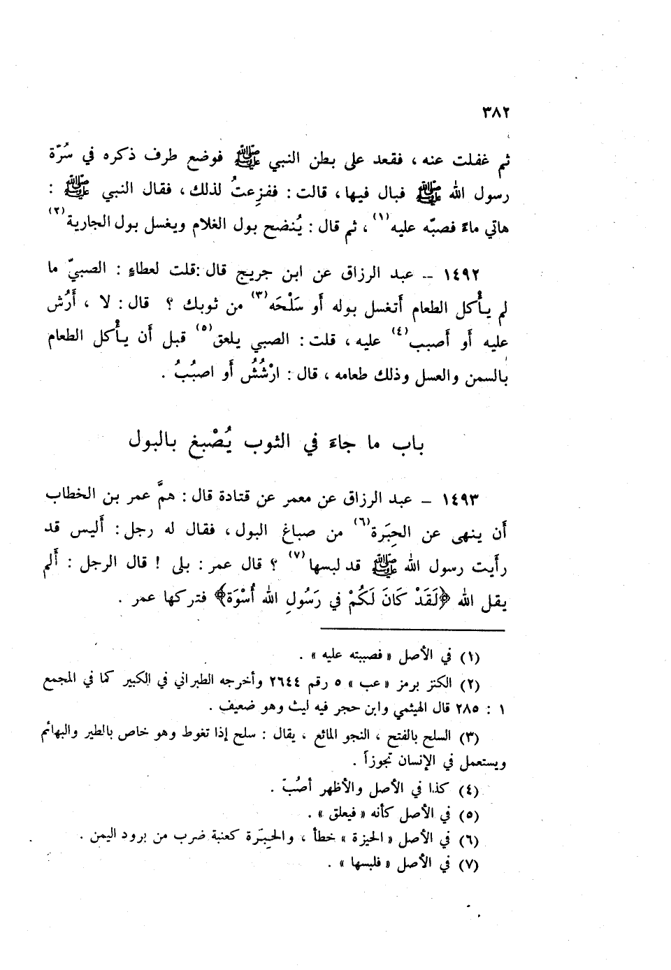 1493 - عَبْدُ الرَّزَّاقِ، عَنْ مَعْمَرٍ، عَنْ قَتَادَةَ قَالَ: هَمَّ عُمَرُ بْنُ الْخَطَّابِ، أَنْ §يَنْهَى عَنِ الْحِبَرَةِ مِنْ صِبَاغِ الْبَوْلِ " فَقَالَ لَهُ رَجُلٌ: أَلَيْسَ قَدْ رَأَيْتَ رَسُولَ اللَّهِ صَلَّى اللهُ عَلَيْهِ وَسَلَّمَ قَدْ لَبِسَهَا؟ قَالَ: عُمَرُ: «بَلَى»، قَالَ الرَّجُلُ: أَلَمْ يَقُلِ اللَّهُ: {لَقَدْ كَانَ لَكُمْ فِي رَسُولِ اللَّهِ أُسْوَةٌ} [الأحزاب: 21] فَتَرَكَهَا عُمَرُ