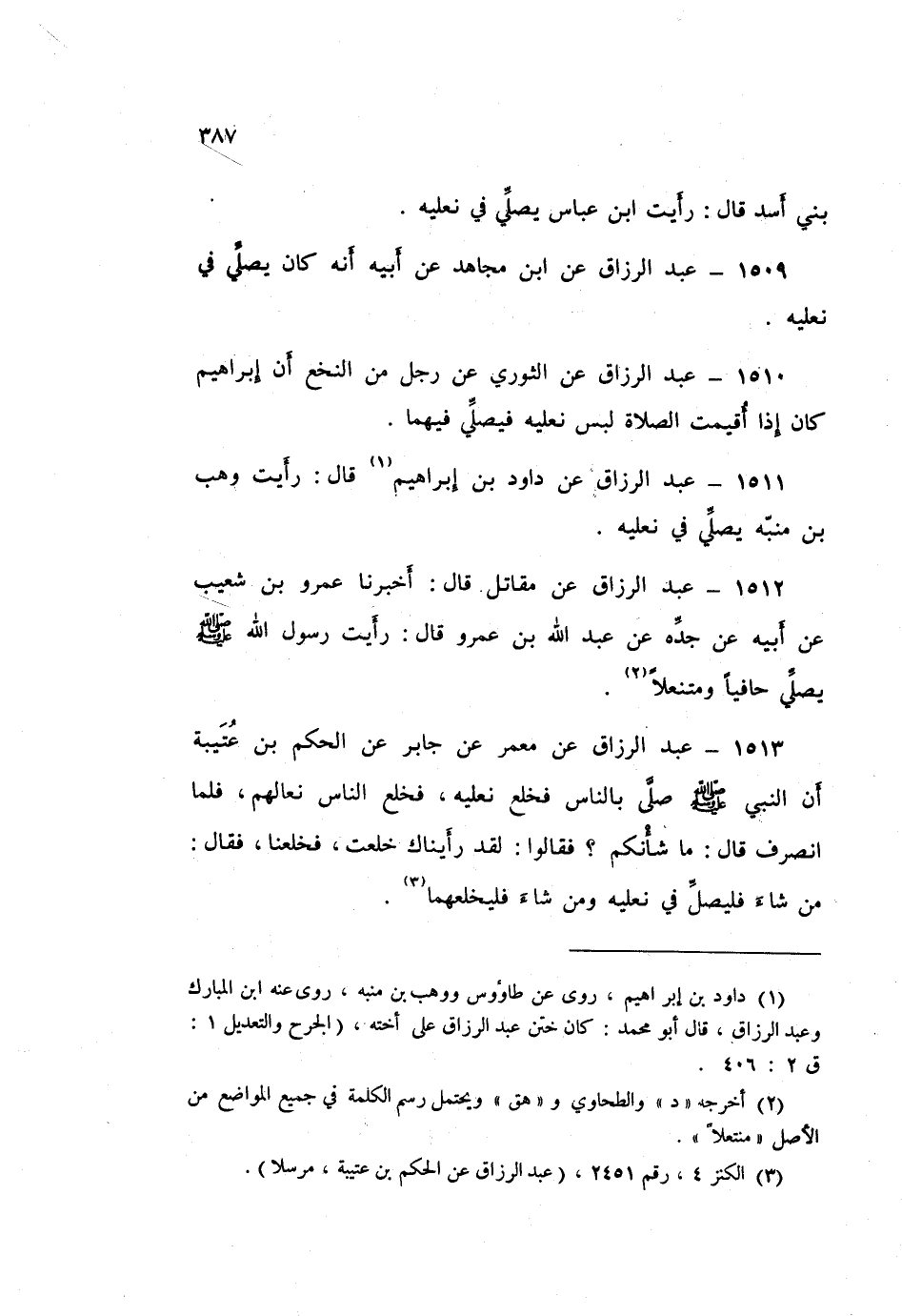 1509 - عَبْدُ الرَّزَّاقِ، عَنِ ابْنِ مُجَاهِدٍ، عَنْ أَبِيهِ: «أَنَّهُ كَانَ §يُصَلِّي فِي نَعْلَيْهِ»